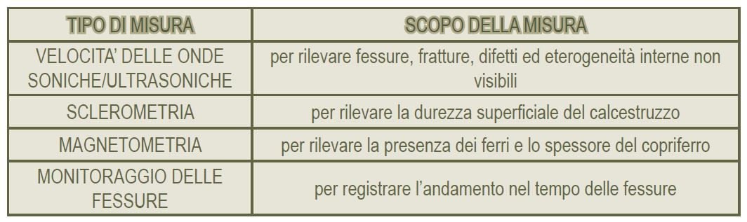 - rilevare la presenza di difetti interni non visibili esternamente (fessure, fratture, ecc.) su una estensione considerevole delle strutture senza ricorrere, in alternativa, ad un numero considerevole di carotaggi: ciò può essere eseguito misurando la velocità delle onde soniche o ultrasoniche che, come è noto, dipende dalla continuità o meno del materiale attraversato dalle onde;