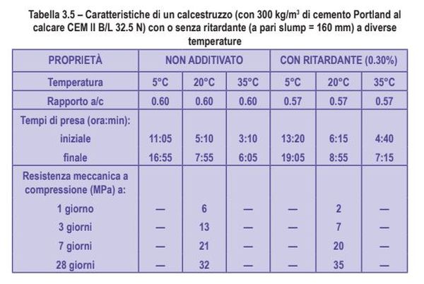 Nella tabella 3.5 sono esemplificativamente mostrate le prestazioni di un additivo ritardante per quanto attiene al tempo di presa in diverse condizioni climatiche. Si può osservare che nel calcestruzzo non additivato i tempi di presa, ed in minor misura le resistenze meccaniche, sono fortemente influenzati dalla temperatura.