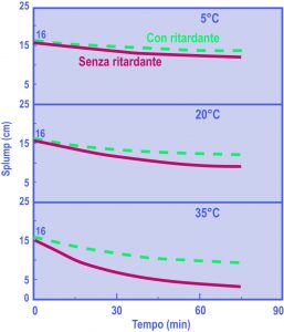 Tuttavia, da un punto di vista pratico è conveniente sperimentare, direttamente sullo specifico calcestruzzo da trattare, l’effetto di un additivo a diversi dosaggi fino ad ottenere il ritardo desiderato in relazione anche alla temperatura ambientale: ovviamente, a parità di ritardo desiderato, il dosaggio richiesto è tanto maggiore quanto maggiore è la temperatura dell’ambiente.