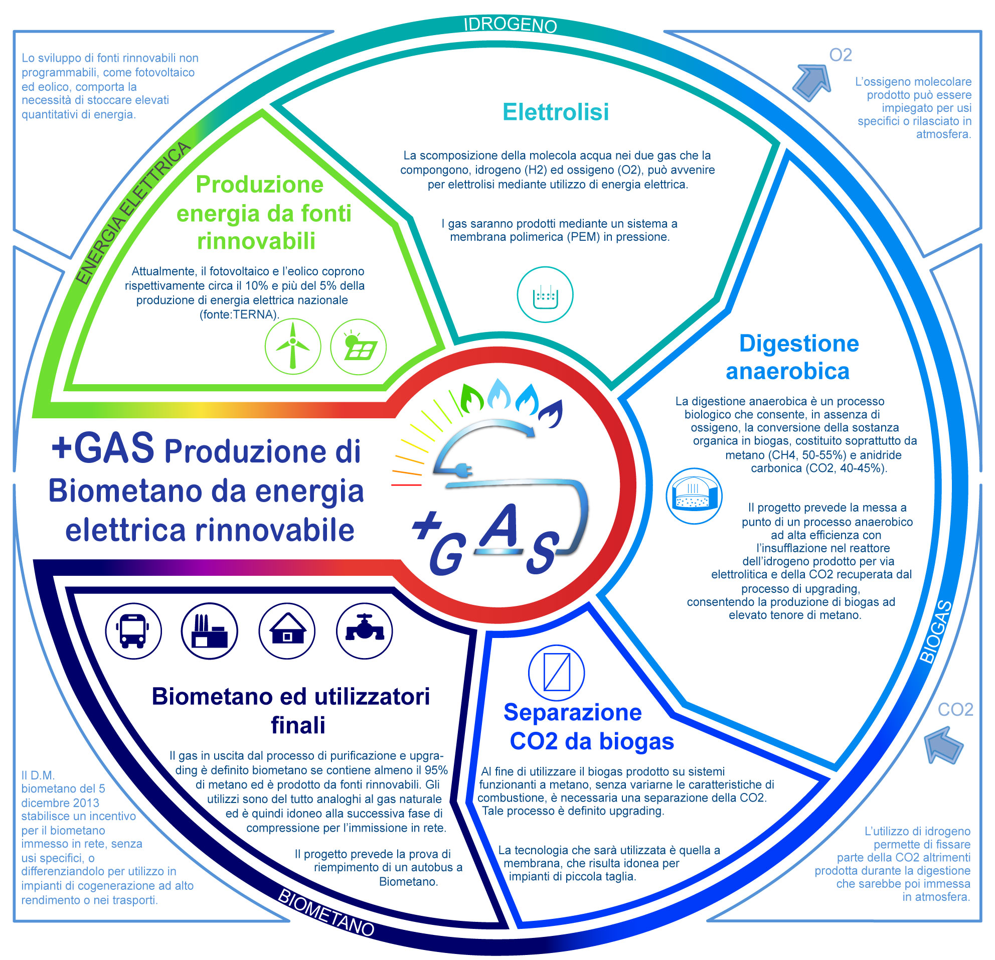 La situazione attuale, nonostante la presenza di alcune fonte rinnovabili, come eolico e fotovoltaico, comporta l’esigenza di garantire comunque una produzione di energia da centrali termoelettriche, generando picchi di produzione e relativi squilibri tra domanda e offerta, con importanti conseguenze sul prezzo dell’energia elettrica. In particolare, la concomitanza di un’importante produzione da rinnovabili non programmabili e situazioni dove si assiste a una transizione industriale, o in cui a fronte di una crisi si ha una riduzione notevole dei consumi, creano le condizioni per un’ampia offerta di energia a prezzi bassi in determinate fasce orarie. Questo fattore comporta, peraltro, una riduzione dei rendimenti attesi delle centrali termoelettriche, che vengono poi recuperati in altre fasce orarie. Il prezzo della componente energia diventa quindi estremamente variabile e al tempo stesso anche un limite per ulteriori investimenti in impianti energetici. Pertanto una pianificazione energetica efficace basata sull’utilizzo di fonti rinnovabili deve necessariamente prevedere anche lo sviluppo di sistemi di accumulo energetico. Il progetto + GAS intende rispondere a questa esigenza.