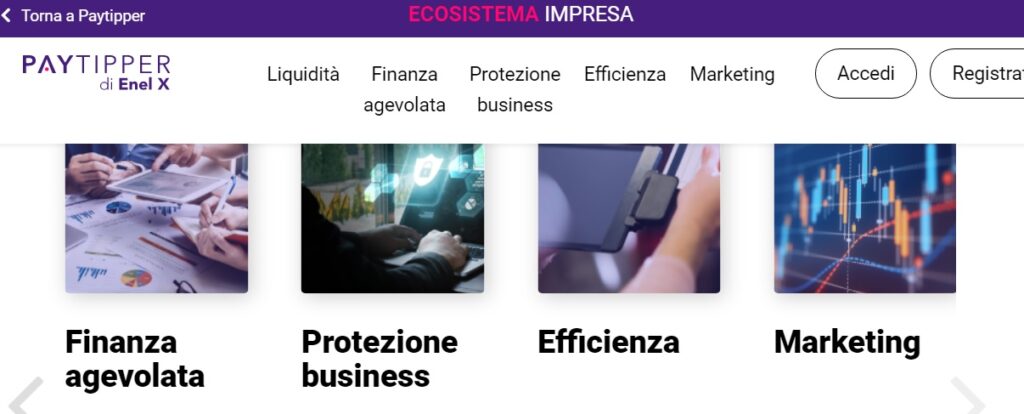 L’innovativa piattaforma digitale per le pmi di Enel X, veicolata attraverso la controllata PayTipper, è operativa dallo scorso ottobre con servizi finanziari, soluzioni di digitalizzazione e sostenibilità del business, strumenti di protezione delle attività e di vendita online e marketing.
