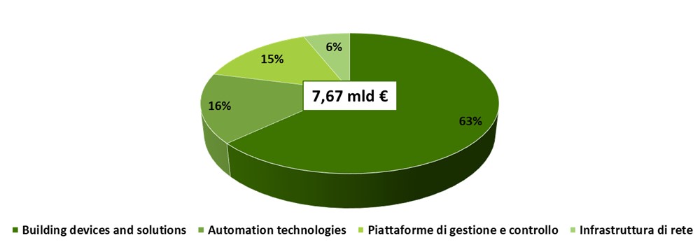Escludendo le superfici opache, il 63% della spesa ha riguardato le building devices & solutions (tecnologie di generazione di energia, di efficienza energetica o che garantiscono il comfort, la sicurezza e la salute degli occupanti: si tratta delle soluzioni che più sono state frenate dalla pandemia, -14,3%, e che riprenderanno a crescere più lentamente), il 16% le automation technologies, cioè la sensoristica finalizzata alla raccolta dati, il 15% le piattaforme di gestione e controllo per elaborare le informazioni e il 6% le infrastrutture di rete.