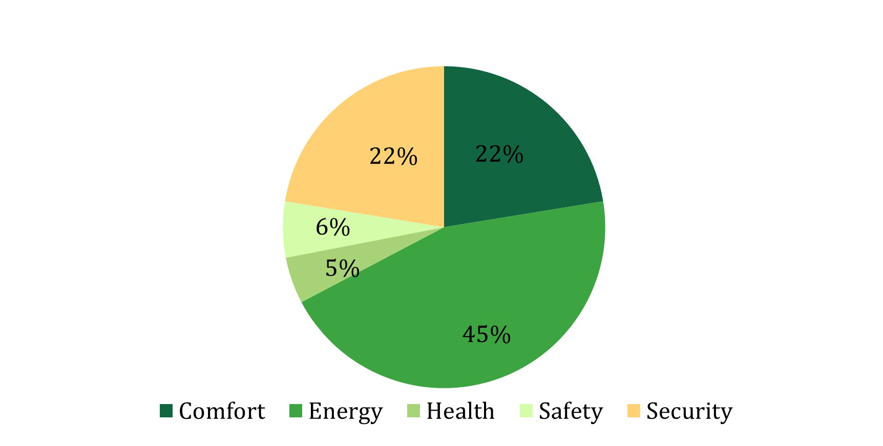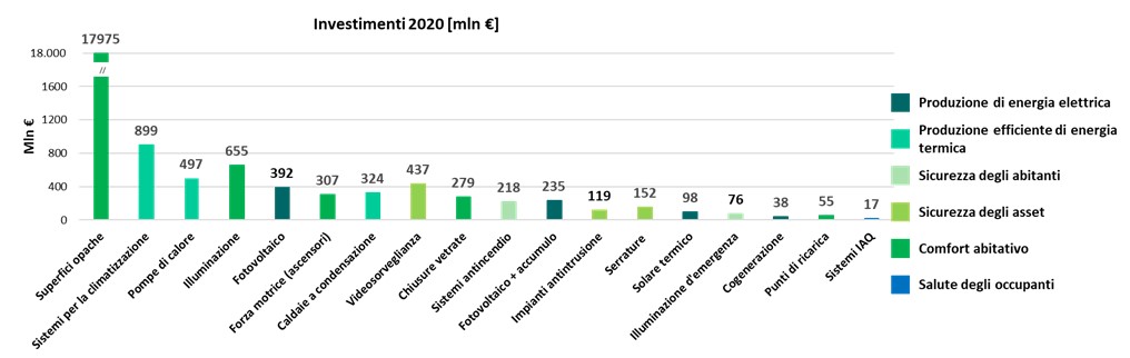 Le tematiche di riduzione dei consumi e sostenibilità ambientale continuano a farla da padrone, catalizzando da sole 4,8 miliardi di investimenti in tecnologie per la produzione efficiente di energia elettrica e termica. La spesa per il comfort abitativo si ferma a 1,3 miliardi di euro (27%), quella per la sicurezza degli abitanti e degli asset a 1 miliardo (20%), mentre è ancora marginale, seppur in continua crescita, il contributo delle tecnologie legate alla salute degli occupanti (0,3%).