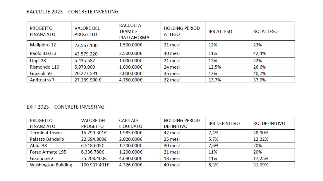 Con questa operazione, sale a 31 il numero delle operazioni immobiliari finanziate in equity crowdfunding da Concrete Investing, con circa 60 milioni di capitali raccolti in cinque anni di attività, più di 3.800 investimenti gestiti e 13 exit realizzate, per un ammontare totale rimborsato agli investitori di circa 26 milioni di euro e rendimenti in linea con le stime.