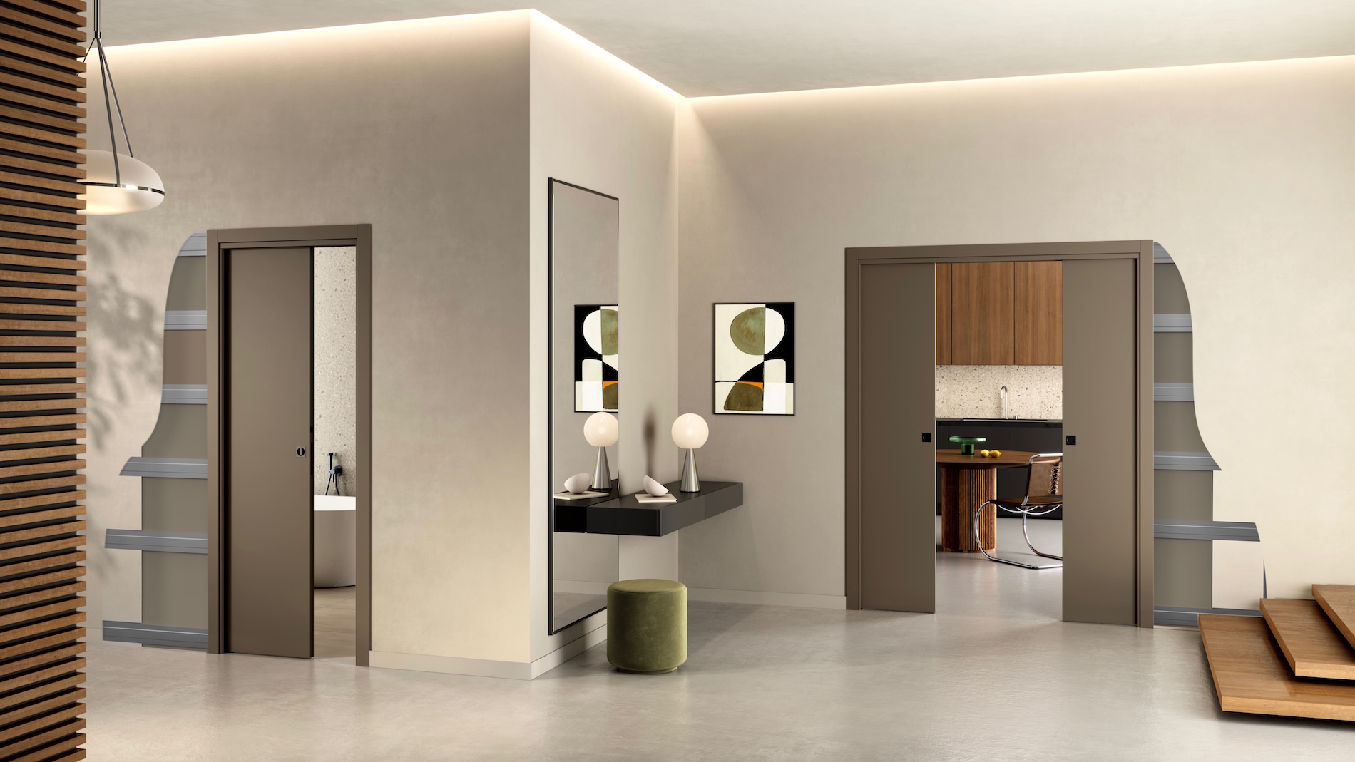 Novità per Ermetika: sono ora disponibili la porta reversibile filo muro xREVERx XL, con altezza di 2400 mm, e EvoKart, un controtelaio scorrevole completo di stipiti e coprifili, studiato appositamente per pareti in cartongesso.