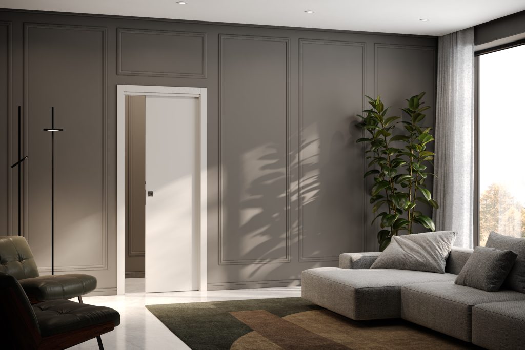 Queste porte filo muro, caratterizzate dall’assenza di elementi quali stipiti e coprifili, si fondono completamente con la parete, regalando un effetto estetico minimale e ricercato.
