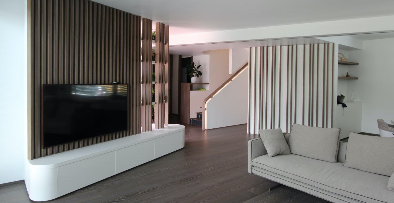 Tutto il resto è materiale di riempimento che si modifica in base alle necessità funzionali e alle relazioni con il contesto in cui il progetto è inserito: verso la strada, al livello superiore, la casa è introversa e chiusa, mentre si apre sul giardino privato sottostante e diventa trasparente, facendo diventare la natura circostante una parte integrante dell’architettura d’interni, in conformità alla concezione ecologica della casa dentro la natura e all’attenzione verso l’inserimento dell’edificio nello spazio esterno.
