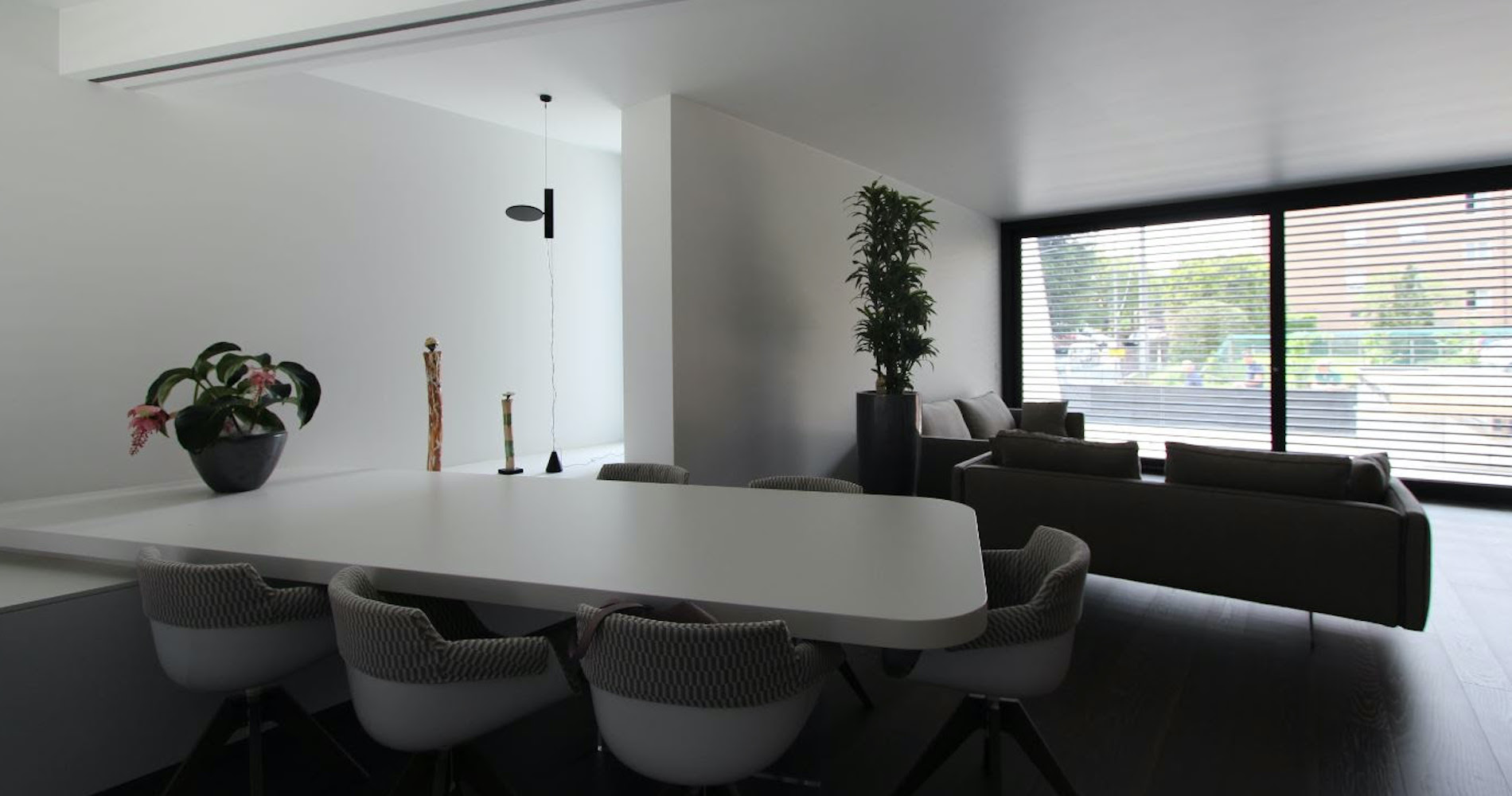 Exogram House n. 2 è una casa unifamiliare che si sviluppa su tre livelli: un piano seminterrato con taverna e vani accessori, il piano terra adibito a zona giorno e il primo piano adibito a zona notte. Le ampie aperture vetrate poste lungo l’asse est-ovest permettono di sfruttare al meglio l’illuminazione naturale e offrono una visuale verso il giardino antistante il fabbricato.