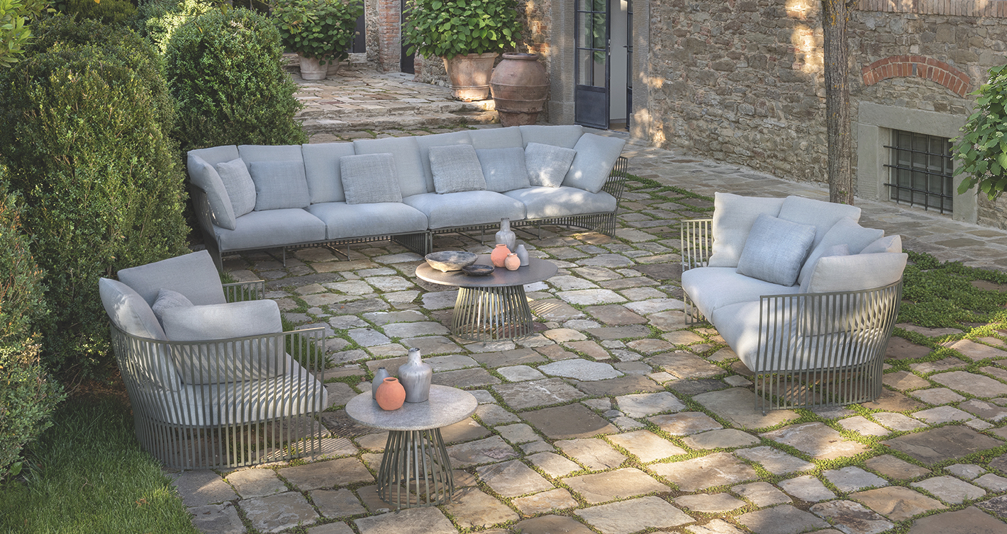 I soffici e generosi cuscini che completano le sedute sono caratterizzati da un’imbottitura perfettamente impermeabile, realizzata con materiali riciclati, e rivestita con tessuti 100% outdoor di eccezionale morbidezza. Con la loro speciale texture, i cuscini contribuisco a creare un effetto visivo ancora più sorprendente.