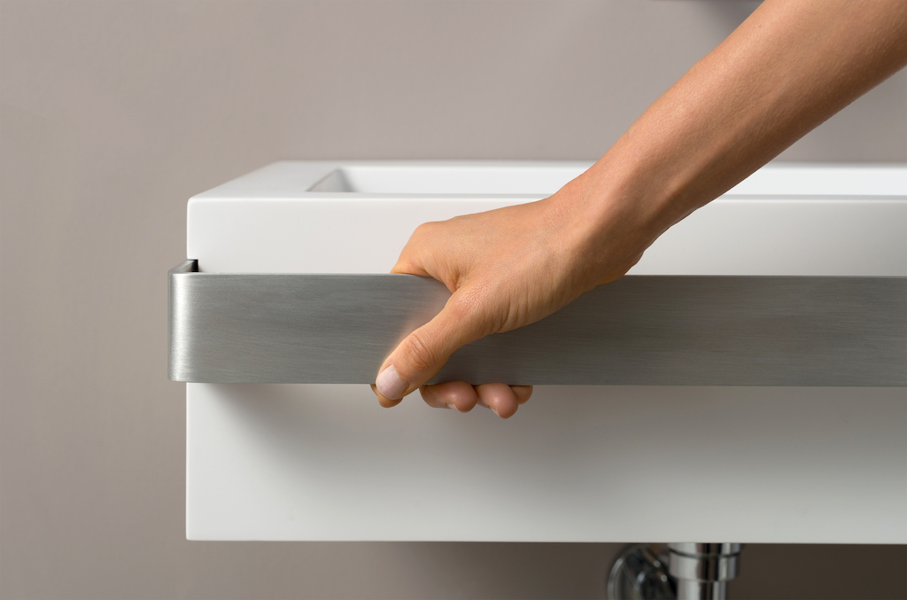 La maniglia frontale, che è anche un portasalviette e offre un robusto sostegno, è integrata lateralmente per non sporgere.