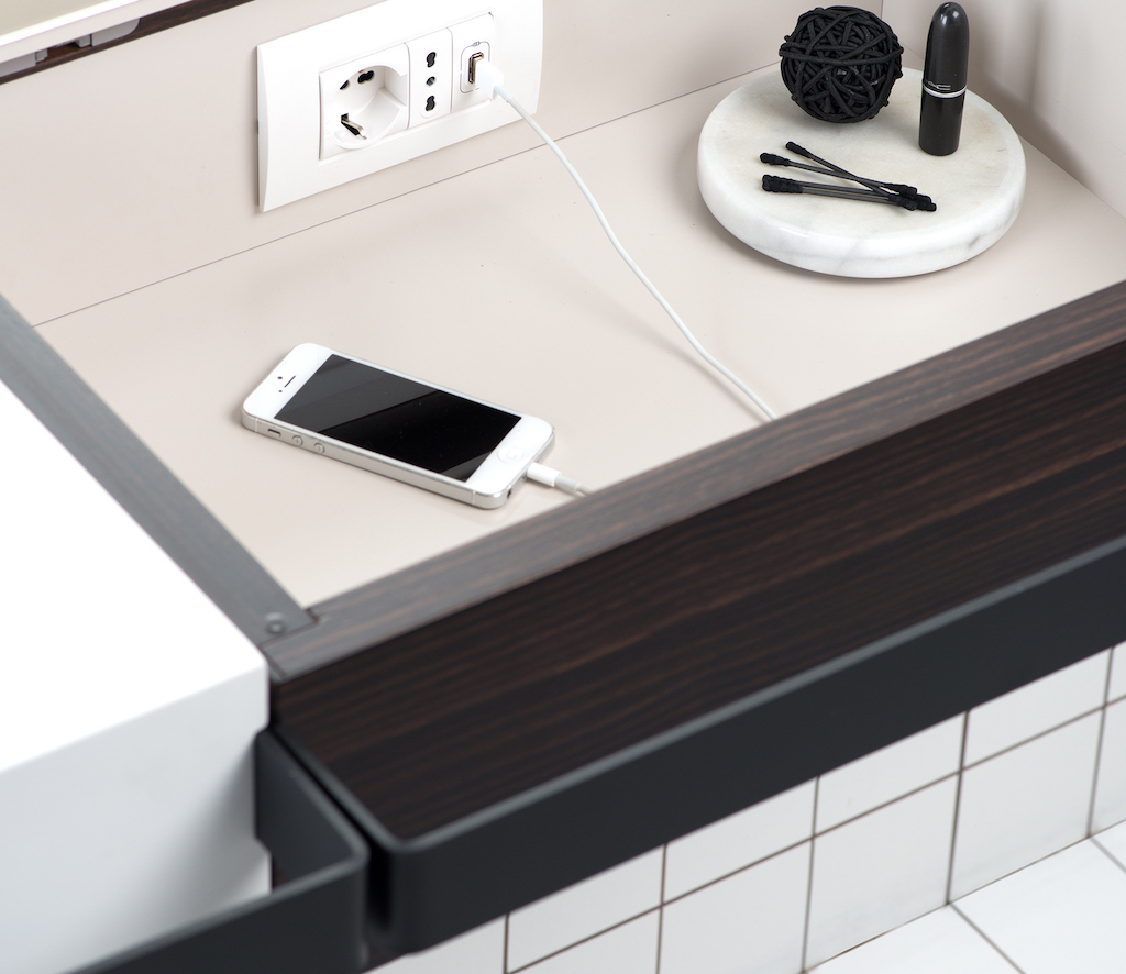 Quando viene aperto, il modulo contenitore dispone di un vano accessoriabile con una tripla presa elettrica standard, tedesca e usb.