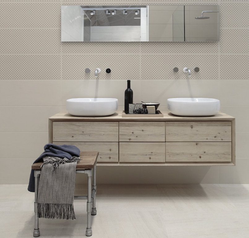 Nelle foto, mobile bagno sospeso della collezione Modern Sign di Mobart Ben realizzato in Larice spaccato tinta Terra, finitura ad olio, con cassettoni incassati in luce nella struttura dogata con bordo inclinato e taglio a 45 gradi. Cassettoni con apertura tramite gola continua su tutta la loro lunghezza. La foto è stata realizzata presso lo showroom Ragno, collezioni Trend e Lifestyle.