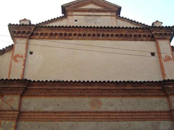 Decorazioni in laterizio. Si tratta di un articolato impianto decorativo che conclude il fronte, collocato com’è alla sommità̀ delle lesene, dalla più̀ alta delle quali s’imposta il timpano. Originariamente coperte interamente da uno strato di cocciopesto, le fasce decorative presentavano patologie di degrado diffuse e di varia natura, riconducibili tutte alla progressiva perdita di capacità protettiva delle coperture in coppi e alla conseguente lacunosità̀ della funzione idraulica delle stesse, con evidenti segni d’infiltrazione, fessurazione e dilavamento. Oltre a fenomeni di disconnessione, dovuti alla perdita di capacità adesiva del legante, si osservavano diffusi fenomeni di disgregazione con perdita del modellato, erosione alveolare ed esfoliazione delle superfici modellate.