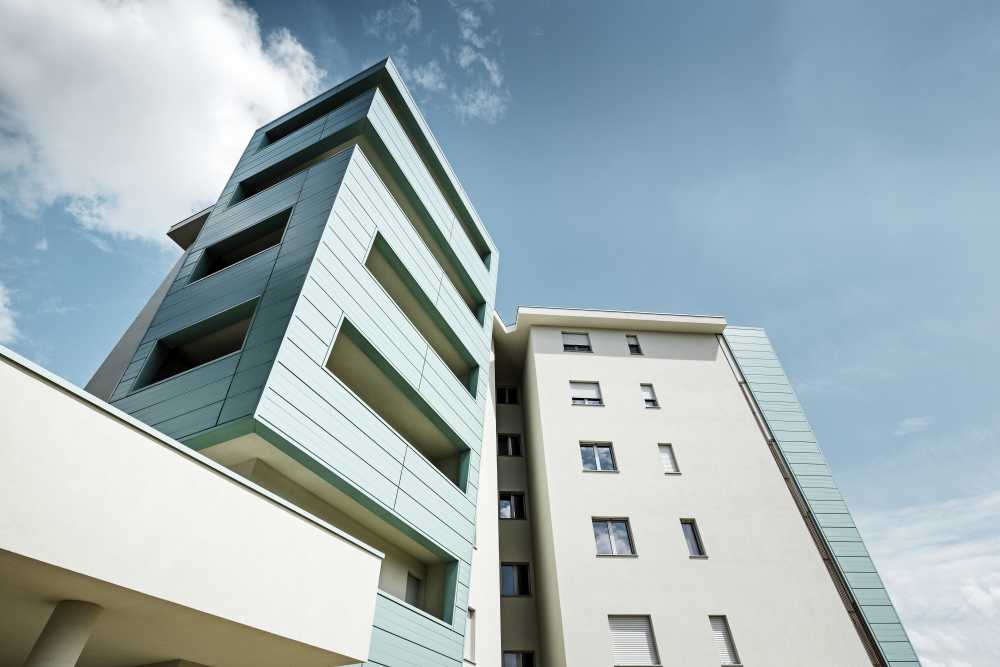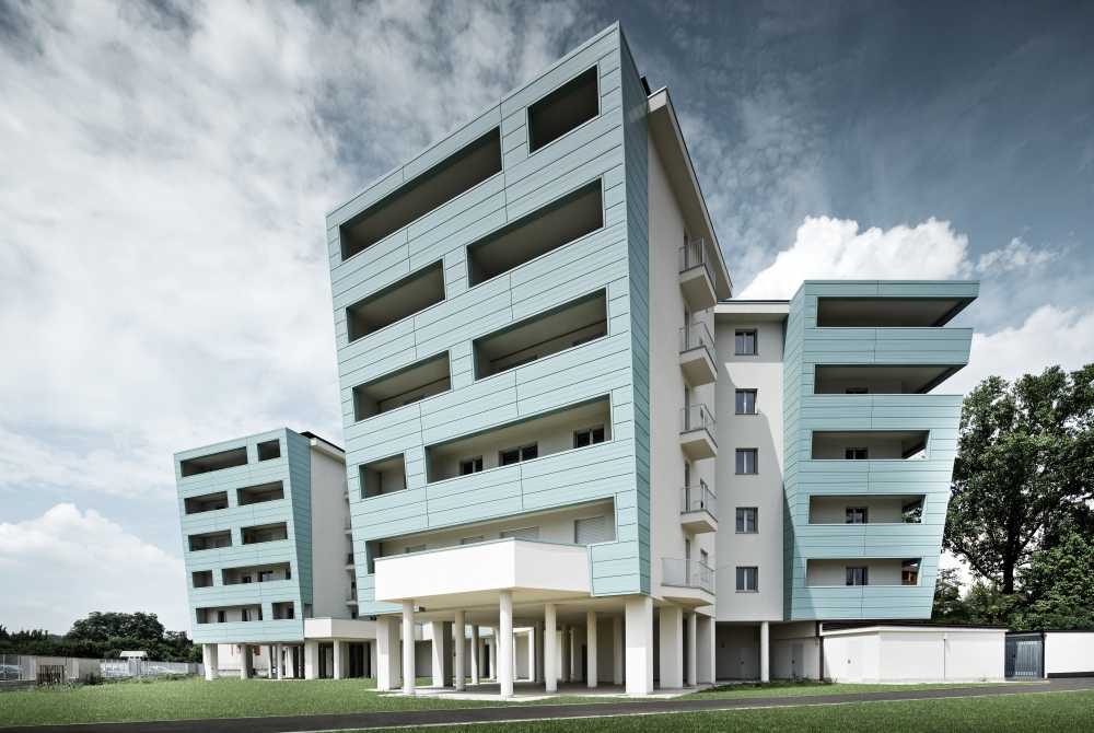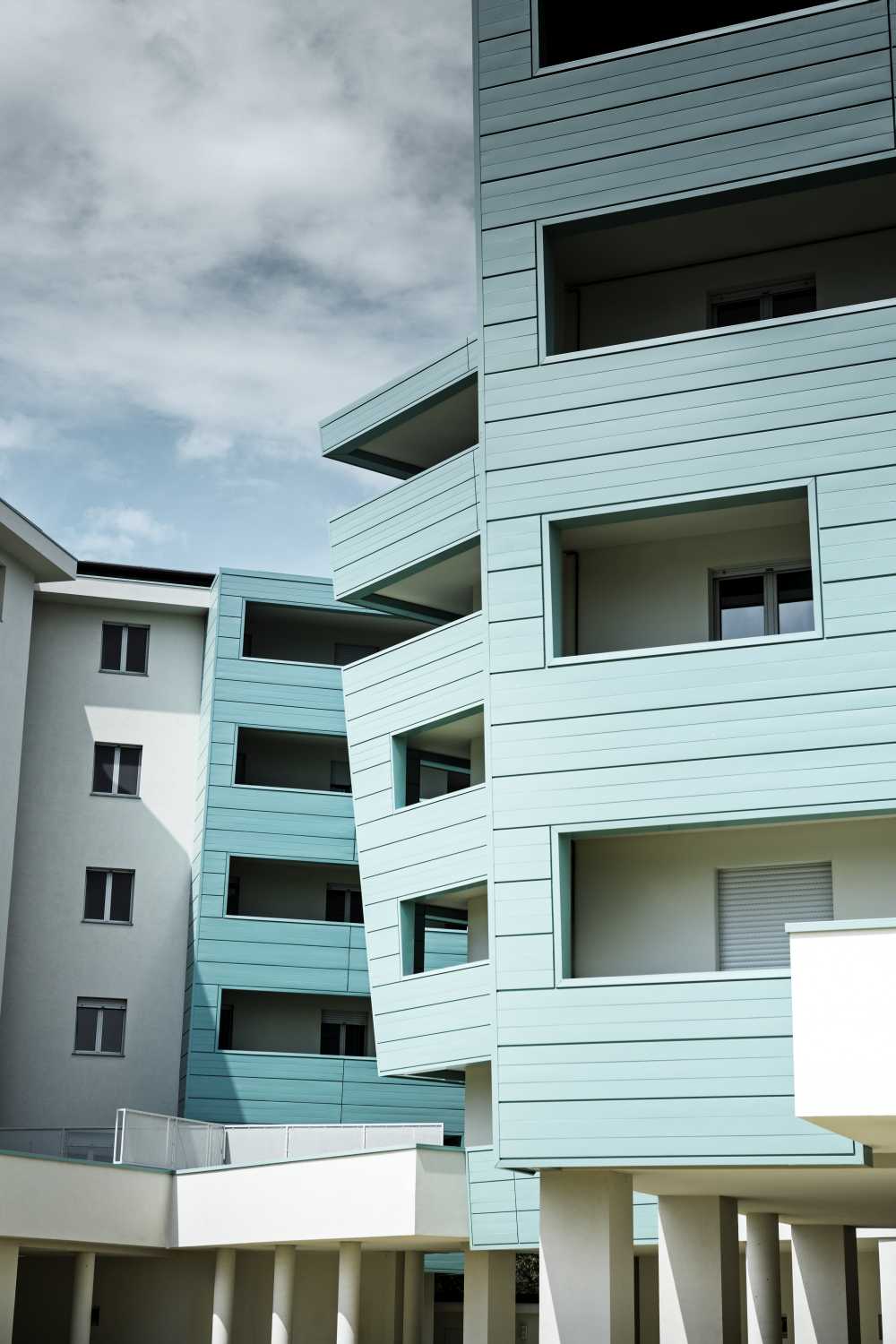 Dietro le facciate Prefa in verde opale del complesso residenziale progettato da Fabio Buttigliero e Filippo Cornero di Gap Studio si articolano gli spazi abitativi di 80 appartamenti con una superficie totale di circa 20.000 mq.