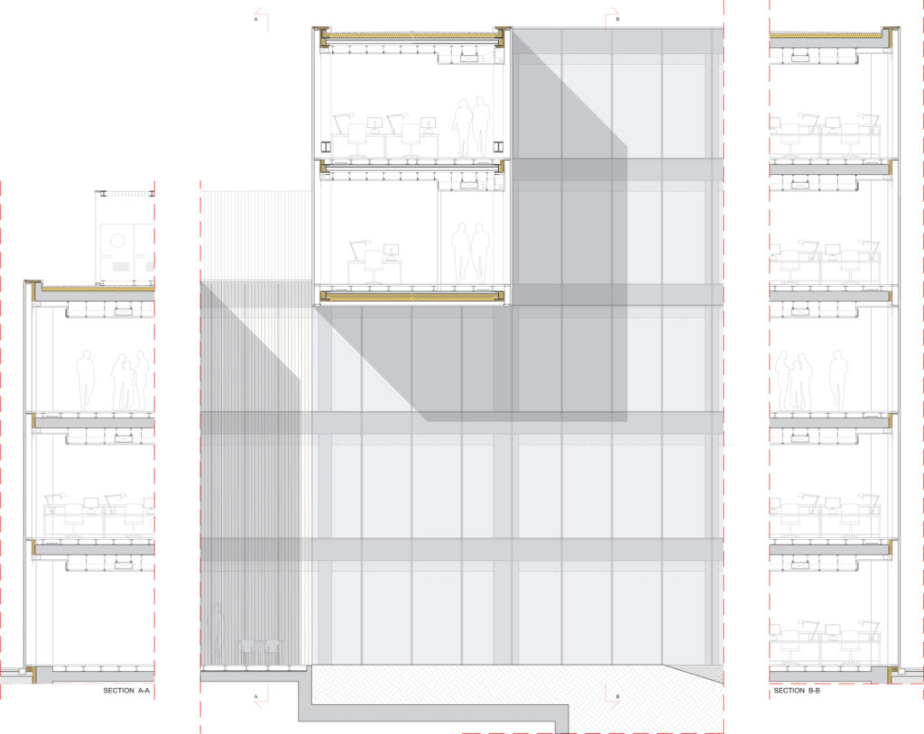 Le specchiature e i pannelli in lamiera sono uniti ai profili del sistema di facciata a costituire una cellula di facciata capace di interconnettersi meccanicamente con le cellule adiacenti e garantire la continuità dell’elemento di chiusura verticale.