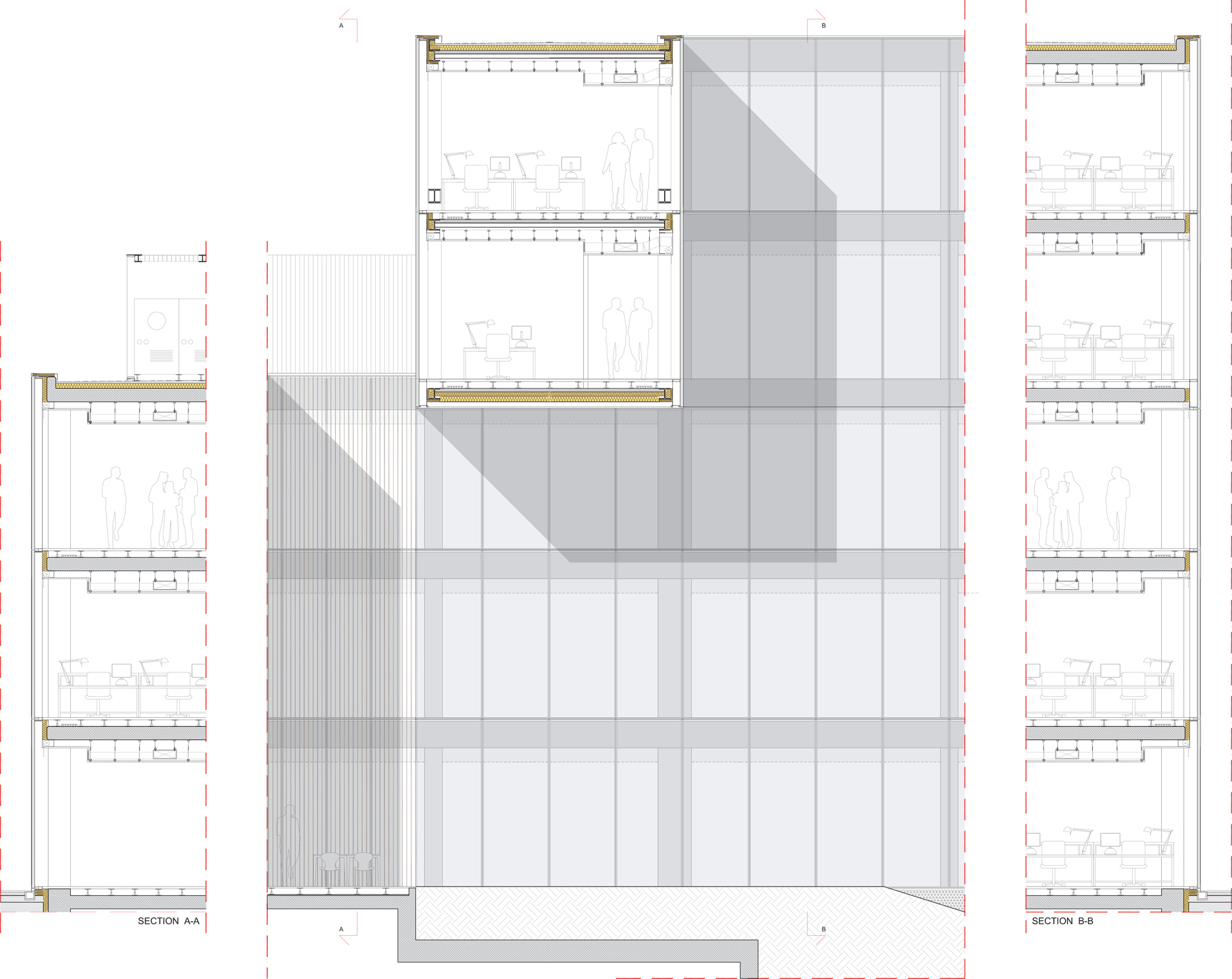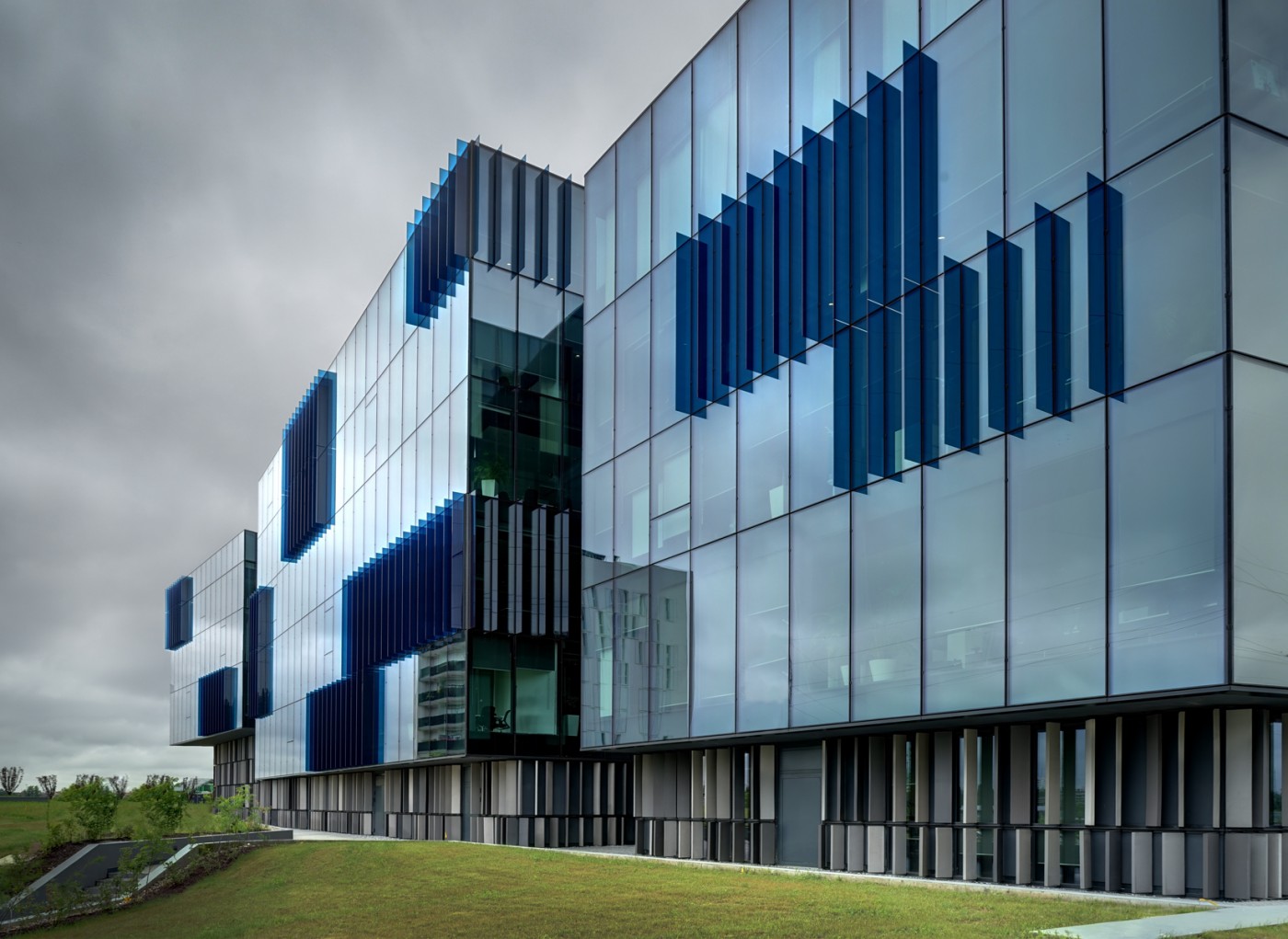 La facciata si completa di frangisole verticali di vetro con altezza variabile fino a 4,4 m, profondità 40 cm, costituiti da un vetro singolo stratificato 66.4, fissati meccanicamente al montante delle cellule mediante un profilo di alluminio interposto e sigillato alla lastra di vetro.
