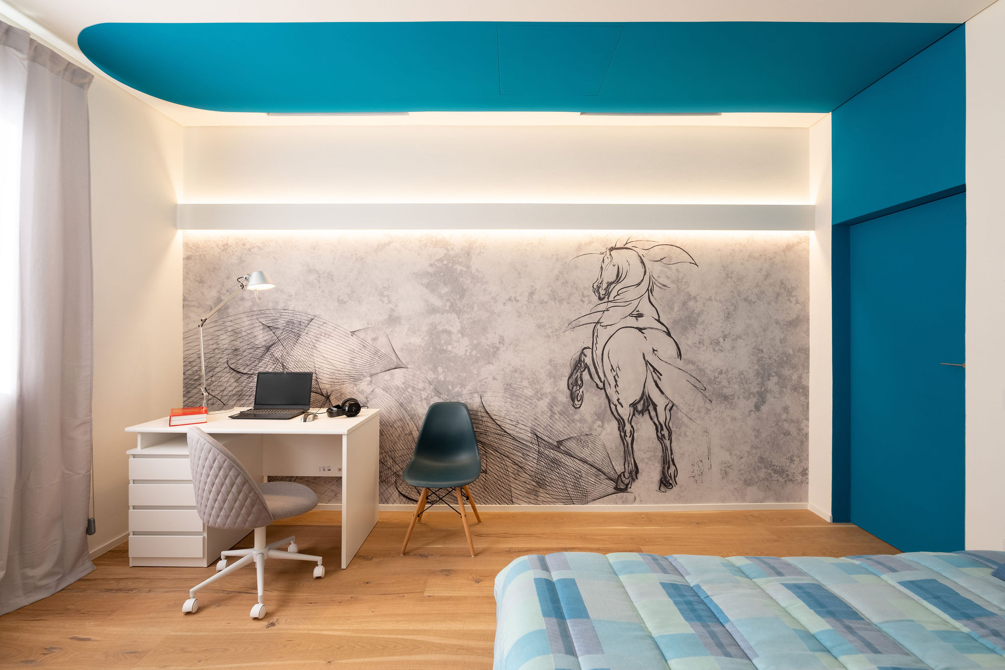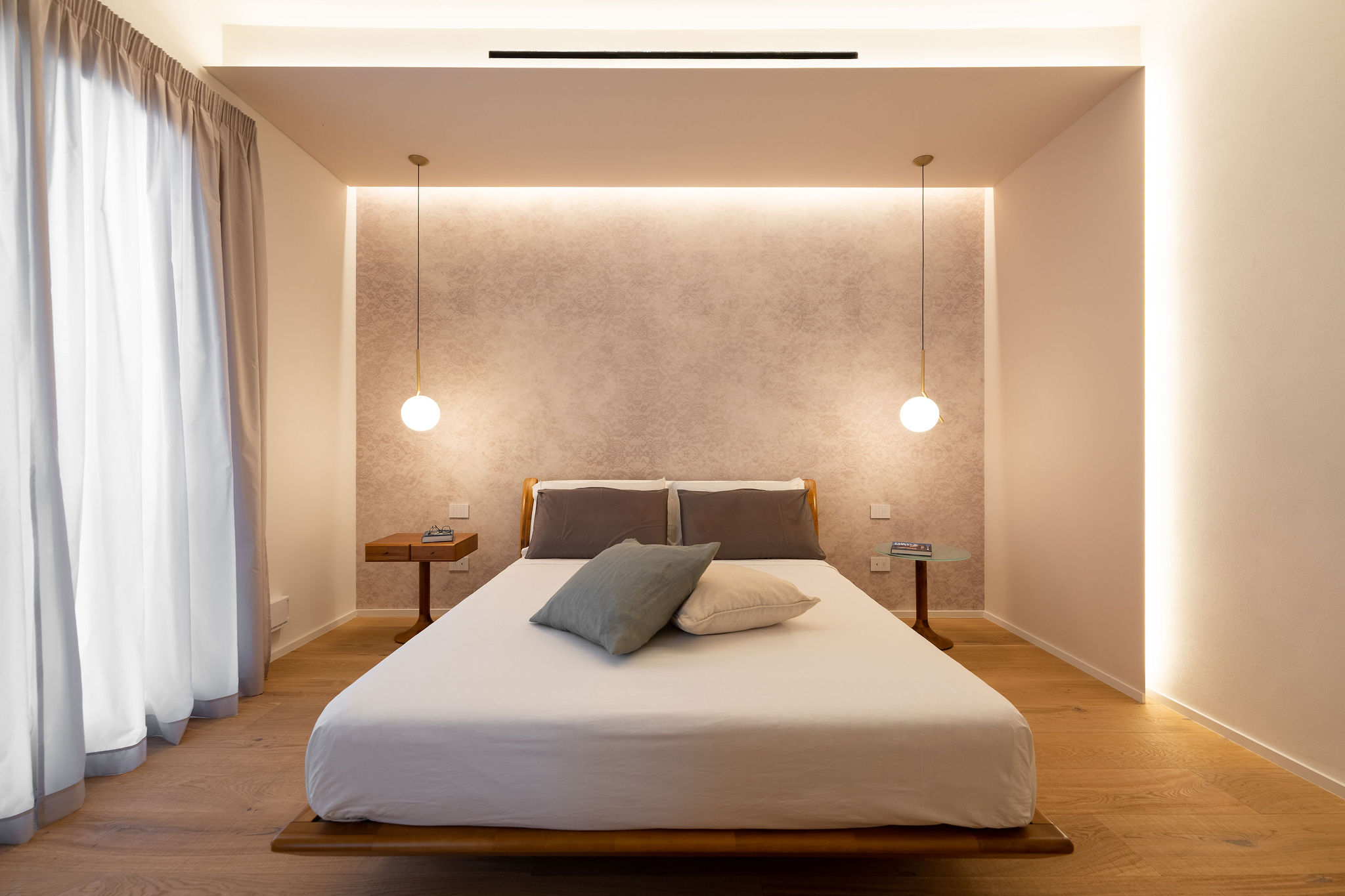 Il primo piano è riservato alla zona notte, composta dalla camera principale con bagno e cabina armadio e da altre due camere, ampie e luminose, caratterizzate da rivestimenti parietali con carte da parati personalizzate. Nella cantina, situata al piano interrato, e nel sottotetto, trasformato in un’accogliente mansarda, è stata mantenuta un’atmosfera più domestica e tradizionale, lasciando a vista alcuni componenti strutturali.