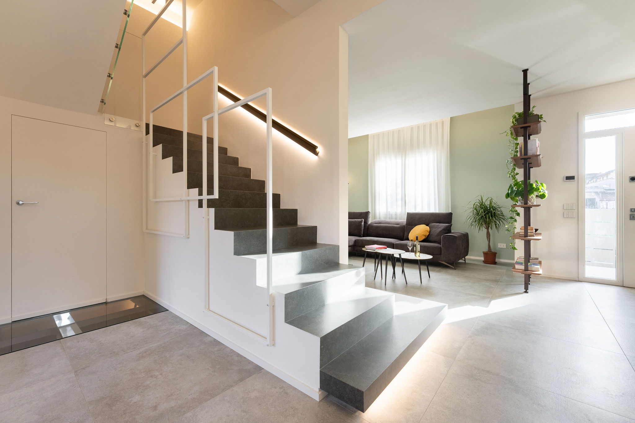 L’abitazione è nata dall’unione di due unità immobiliari sovrapposte: ambienti dal design minimalista, rivestiti con materiali e colori sapientemente intonati, si sviluppano in una sequenza serrata, scanditi da superfici trasparenti ed elementi scultorei. Le nuove finestre e la riduzione delle partizioni murarie interne hanno permesso di inondare gli interni con abbondante luce naturale. In particolare, la valorizzazione del vano scala esistente, diventato parte integrante dell’attuale abitazione su quattro livelli, è stata un aspetto centrale del concept architettonico. Grazie al lucernario tubolare Fakro il vano scale interno è ora illuminato naturalmente.