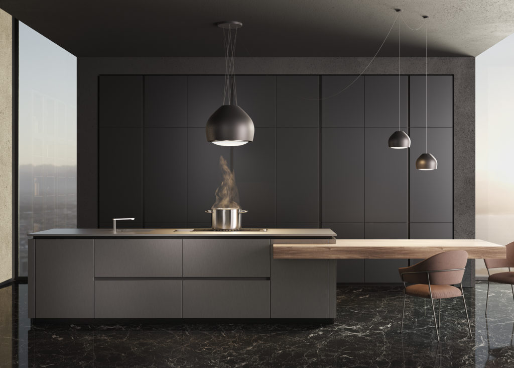 Da sola, in una configurazione di più elementi o coordinata con la cappa Sophie, Sophie Lamp assicura un effetto estetico di grande impatto in cucina e nel living.