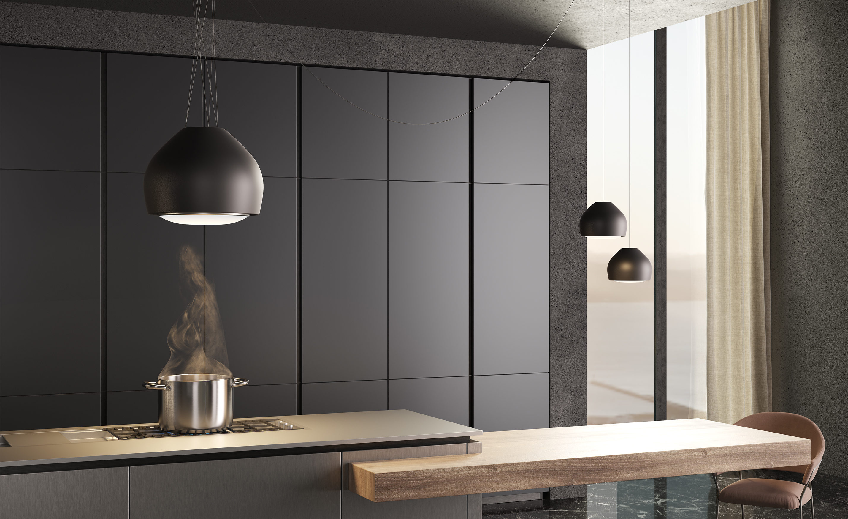 Da sola, in una configurazione di più elementi o coordinata con la cappa Sophie, Sophie Lamp assicura un effetto estetico di grande impatto in cucina e nel living.