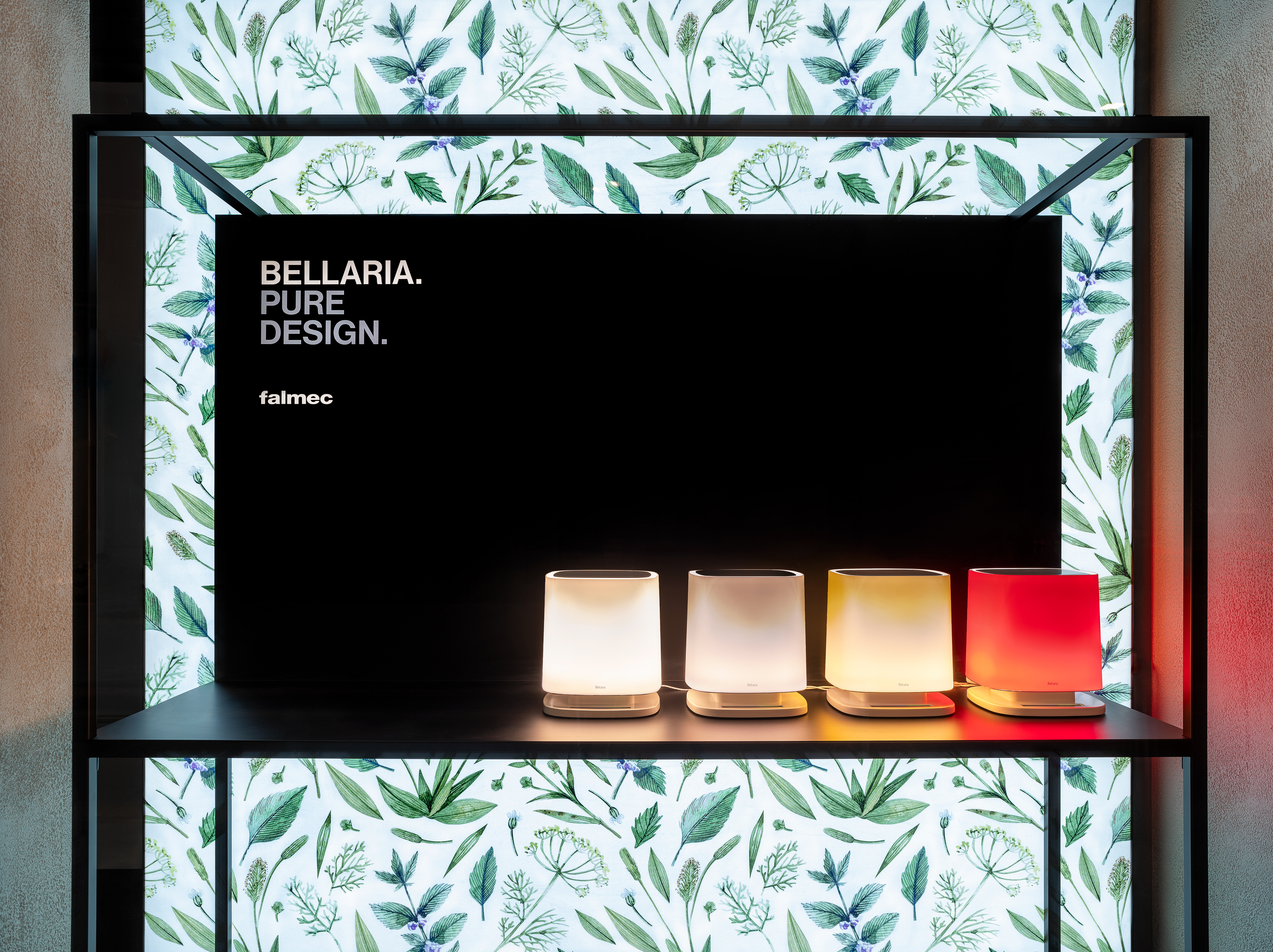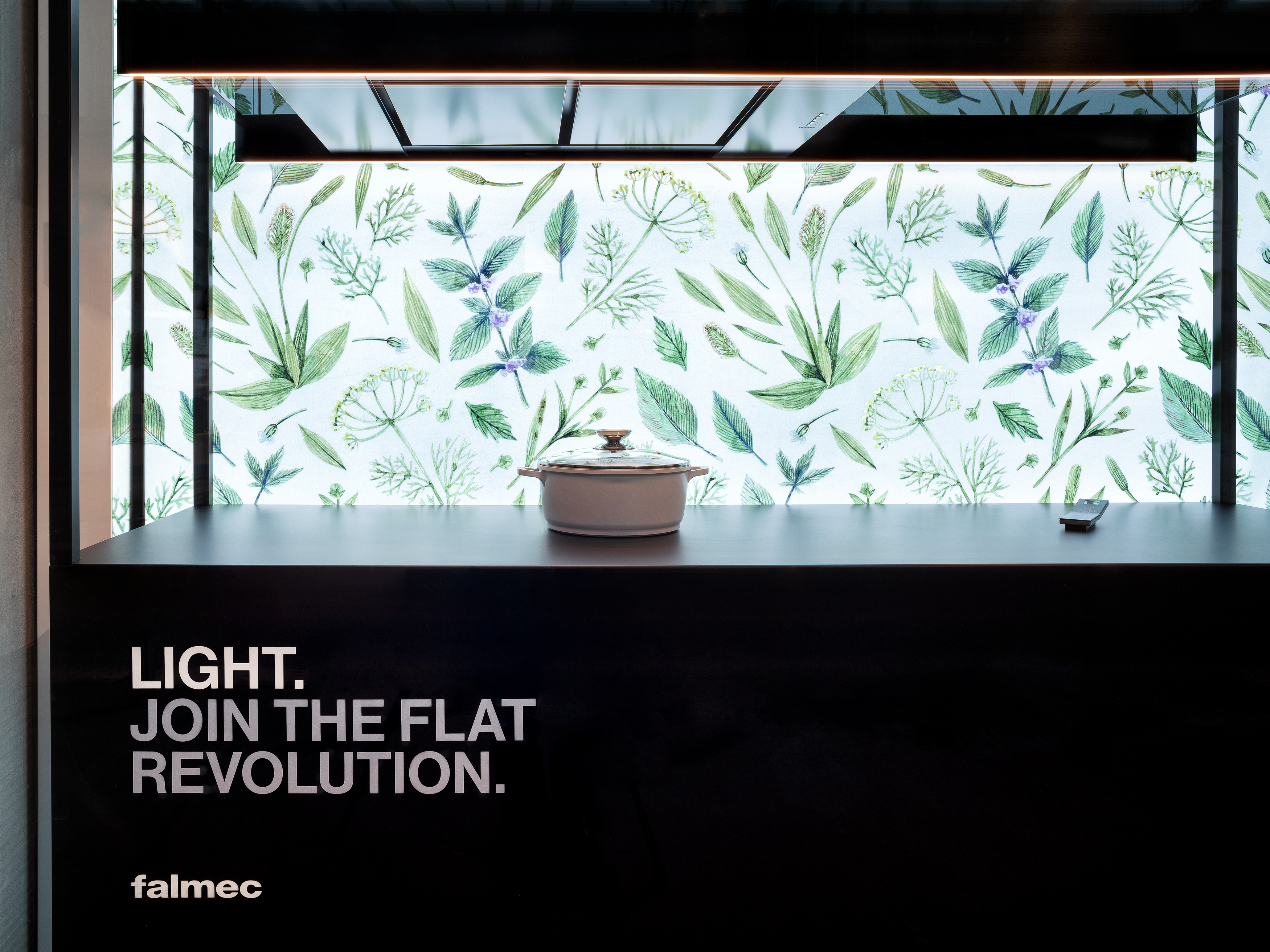 Il backrgound botanico retroilluminato si abbina allo stile sofisticato e minimale dei prodotti Falmec. Nello specifico Light con il suo grande elemento centrale in vetro fumé temperato e i profili laterali in alluminio satinato anodizzato nero, si integra nella struttura realizzata ad hoc per l’allestimento, illuminando il worktop con le due strip led.