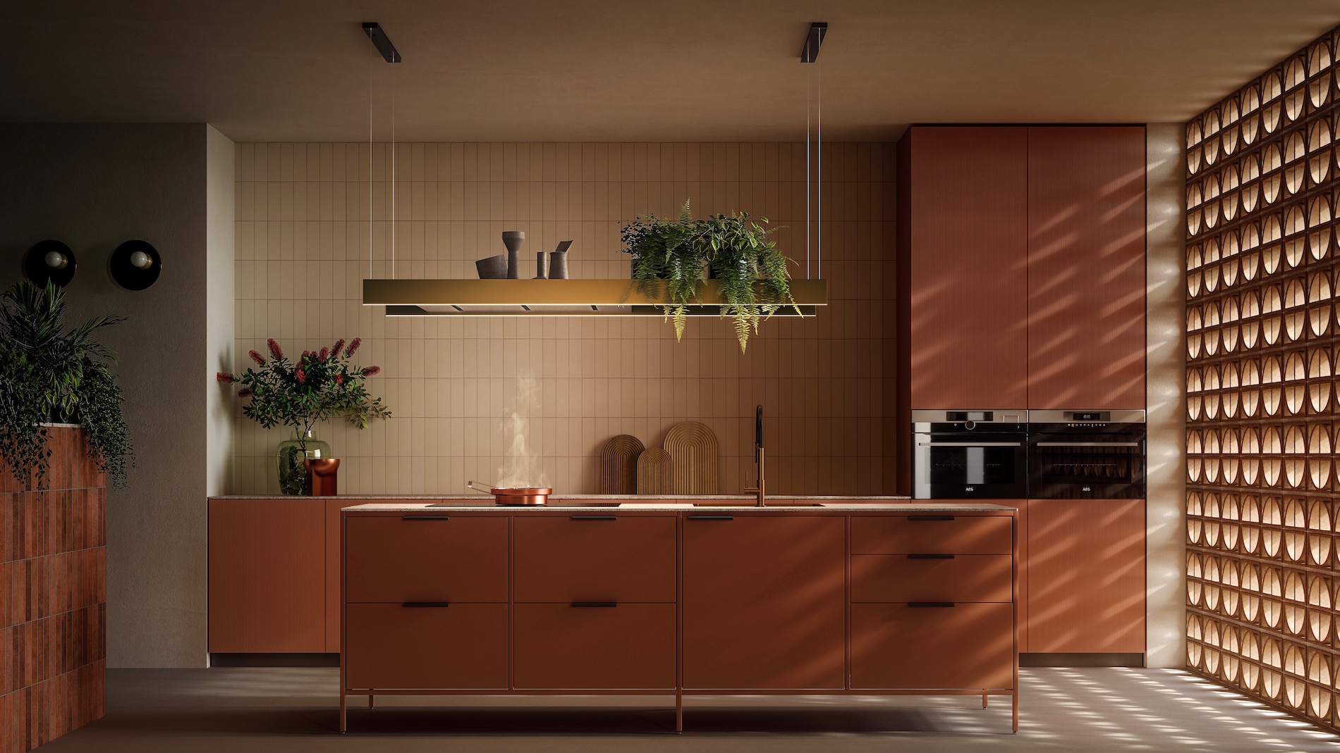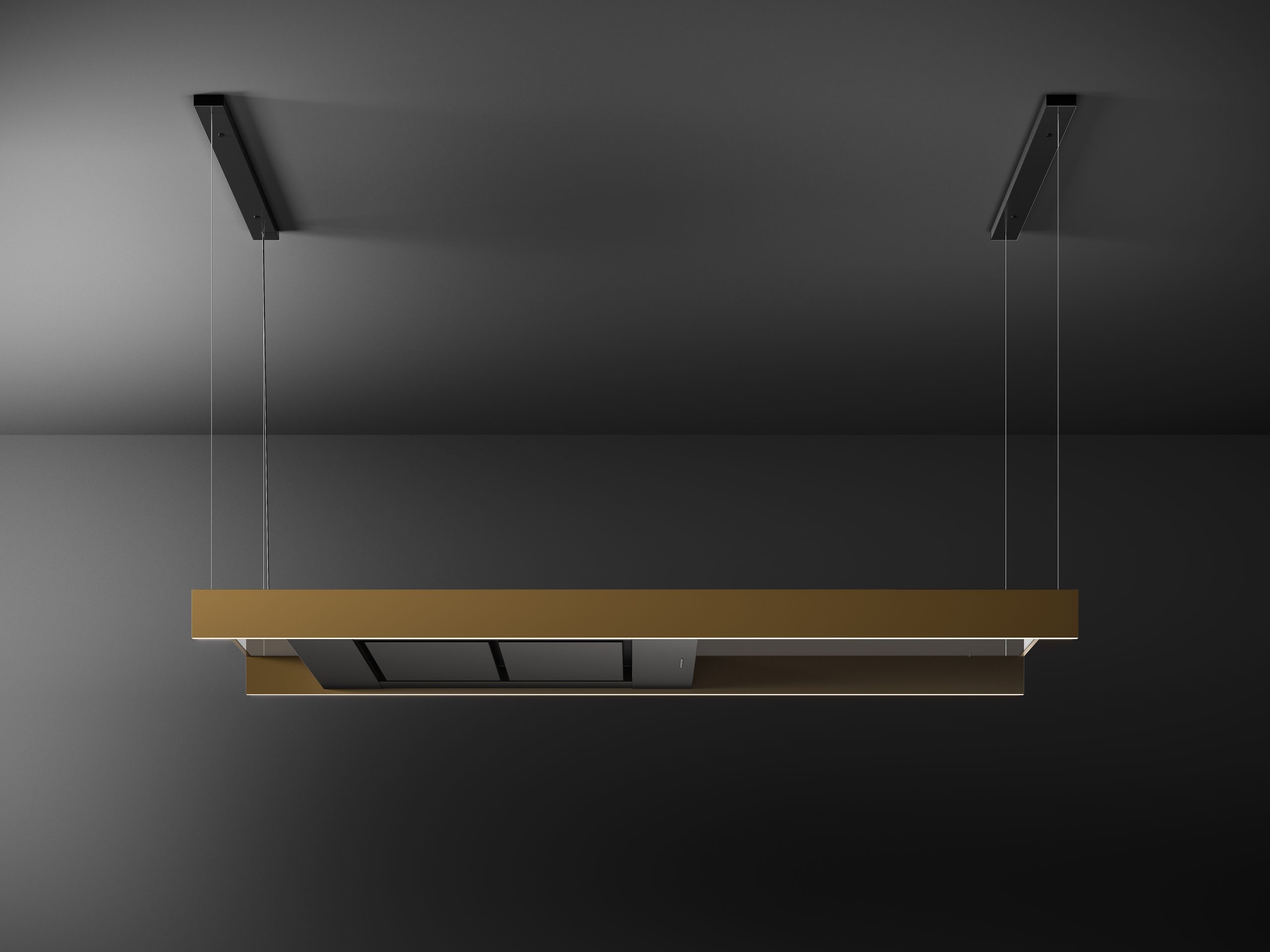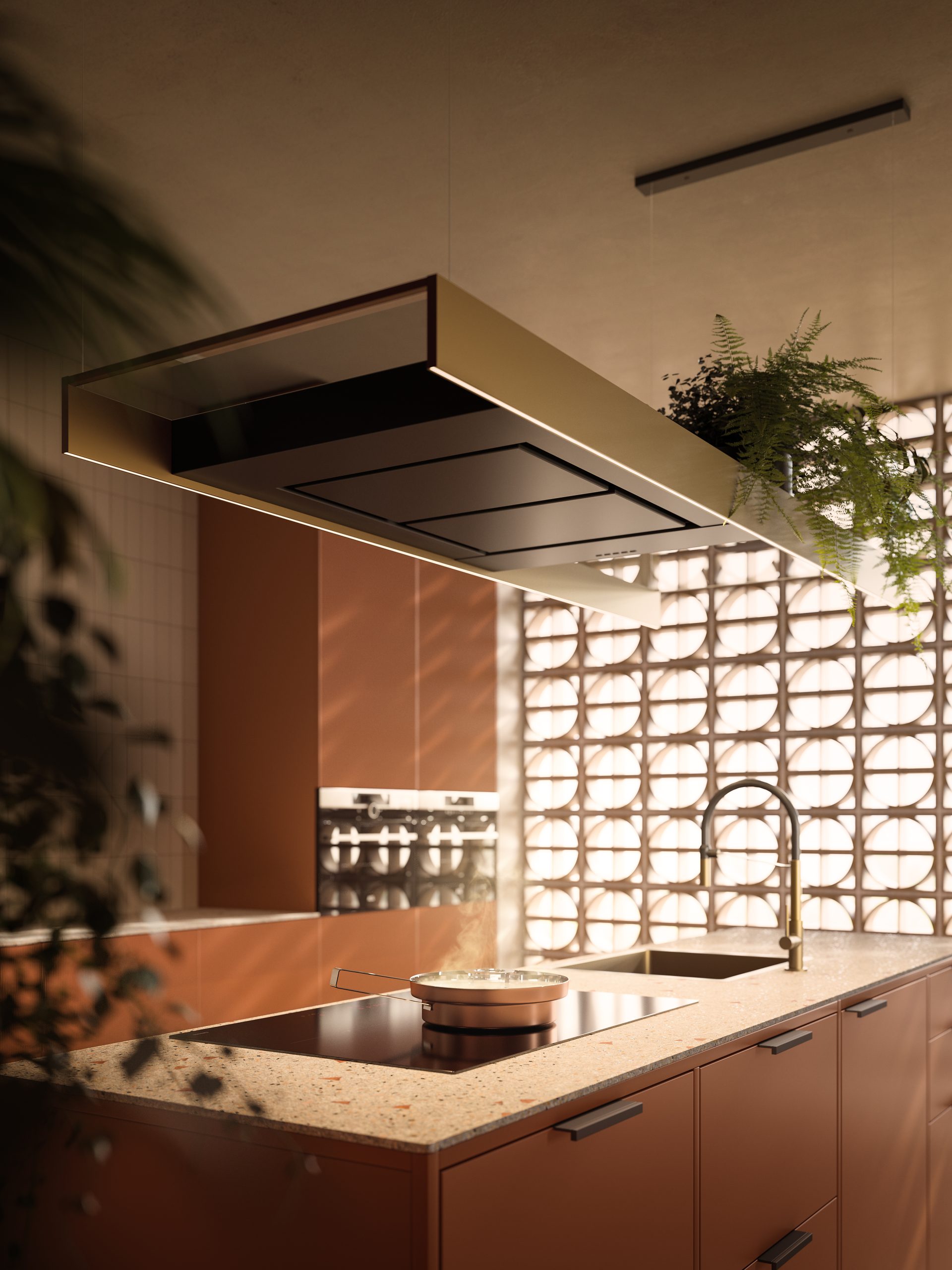 Ideale per cucine ad isola, Light Bronze rimane sospesa sopra il piano cottura, permettendo una vista più libera e ampia, e valorizzando anche gli altri elementi della cucina.