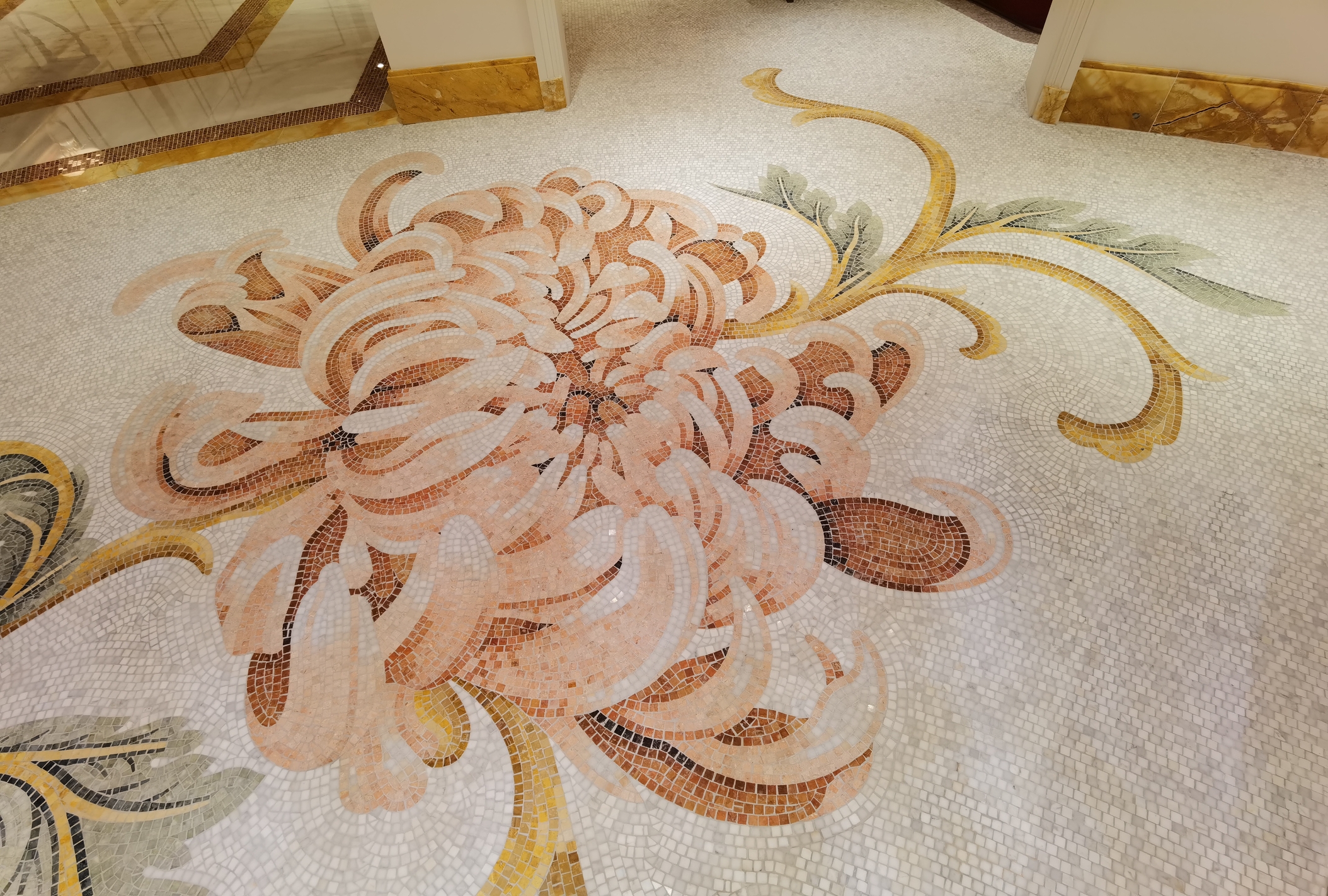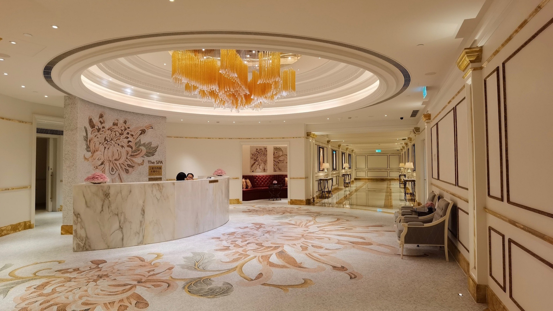 Colori audaci per le piscine interne dell’hotel, con oltre tre milioni e mezzo di tessere di mosaico in vetro e marmo italiano a raffigurare draghi, fiori e simboli tradizionali cinesi di benessere, ricchezza, fortuna e felicità. Nella SPA i mosaici sfumano i toni del rosa pallido, del bianco e del grigio tenue nel pavimento e nelle pareti dell’ingresso, disegnando fiori delicati.