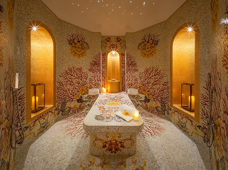 Il saper fare italiano trionfano nell’intervento di Fantini Mosaici anche nelle piscine, la SPA, le camere e il ristorante, numerosi ambienti che hanno richiesto più di sei milioni di tessere di mosaico tagliate e posate a mano dai mosaicisti dell’azienda.