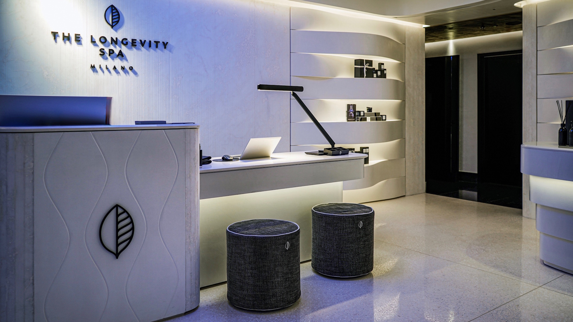 Il concept della SPA, curato da B+Architects, è caratterizzato dall’alternanza di black & white, un minimalismo cromatico che rispetta il carattere dell’edificio storico. Nella Reception della SPA predomina il bianco, declinato in diversi materiali pregiati. Il pavimento, realizzato in seminato bianco, è stato creato in opera dagli artigiani di Fantini Mosaici utilizzando ciottoli di prezioso marmo Lasa, enfatizzati da una finitura lucida.