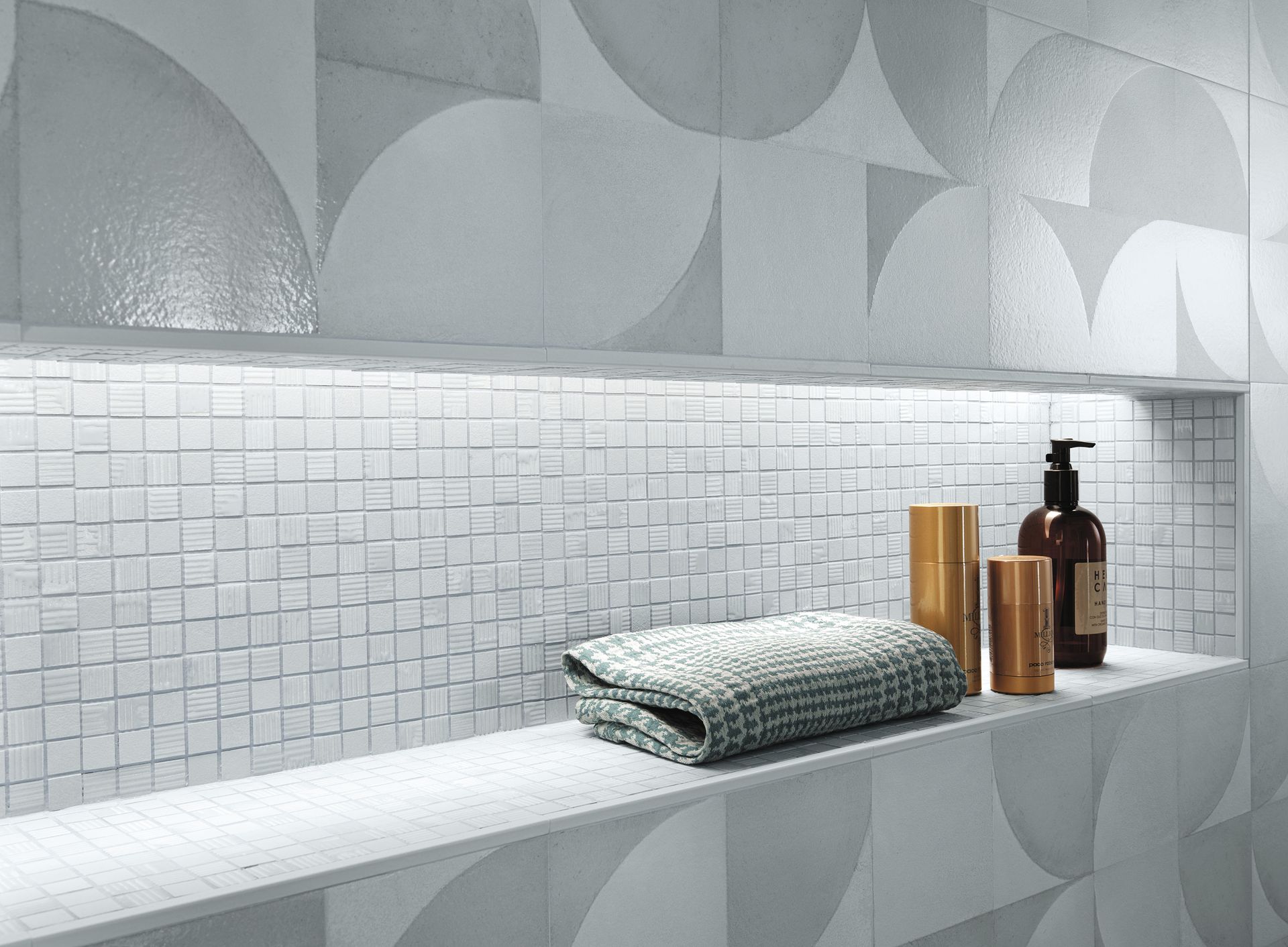 Fap Ceramiche rivisita il concetto di decorazione a parete attualizzando la tecnica del mosaico e dell’inserto attraverso le ottime performance tecnologiche del gres porcellanato e della pasta bianca.