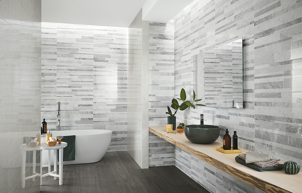 I pavimenti in grès porcellanato sono disponibili nei formati rettificati 120×120, 75×150, 75×75 e 60×60 cm tutti rettificati, mentre i rivestimenti in pasta bianca nei formati cm 25×75 e extra-size cm 50×110 RT. Questi ultimi sono proposti anche nella struttura Line, un elegante cannettato tipico delle lavorazioni contemporanee del marmo.