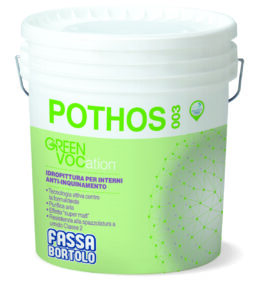 Pothos 003 è un’idropittura, di Fassa Bortolo, composta da particolari polimeri, inerti selezionati, biossido di titanio e additivi a bassissimo contenuto di composti organici volatili, che è in grado di depurare l’aria dai Voc e dalla formaldeide prodotta da finiture e arredi.