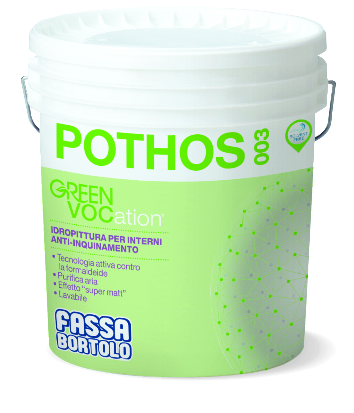 Pothos 003 è un’idropittura per interni traspirante, inodore ed esente da solventi, coprente e superopaca, per una perfetta finitura. Oltre ad essere essa stessa “solvent free”, è in grado di assorbire fino al 74% della formaldeide presente nell’ambiente, per una durata di ben 10 anni.