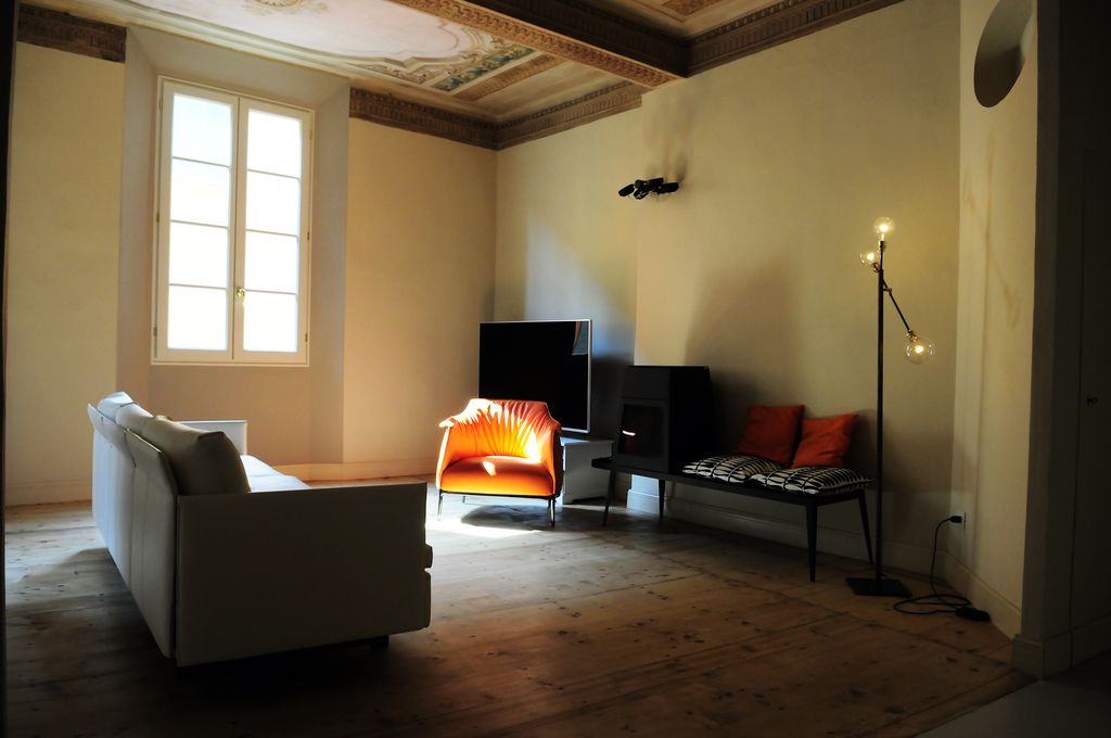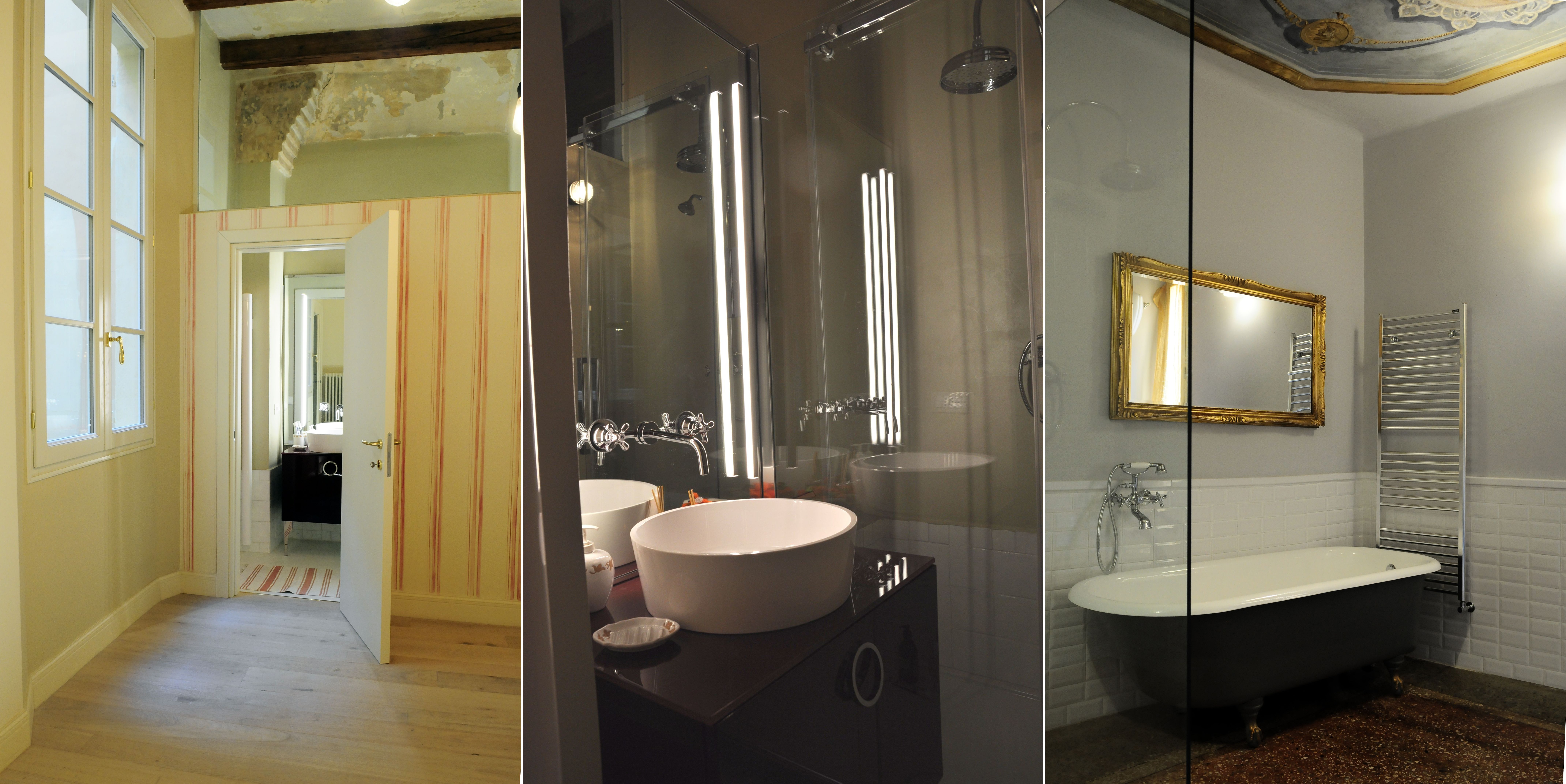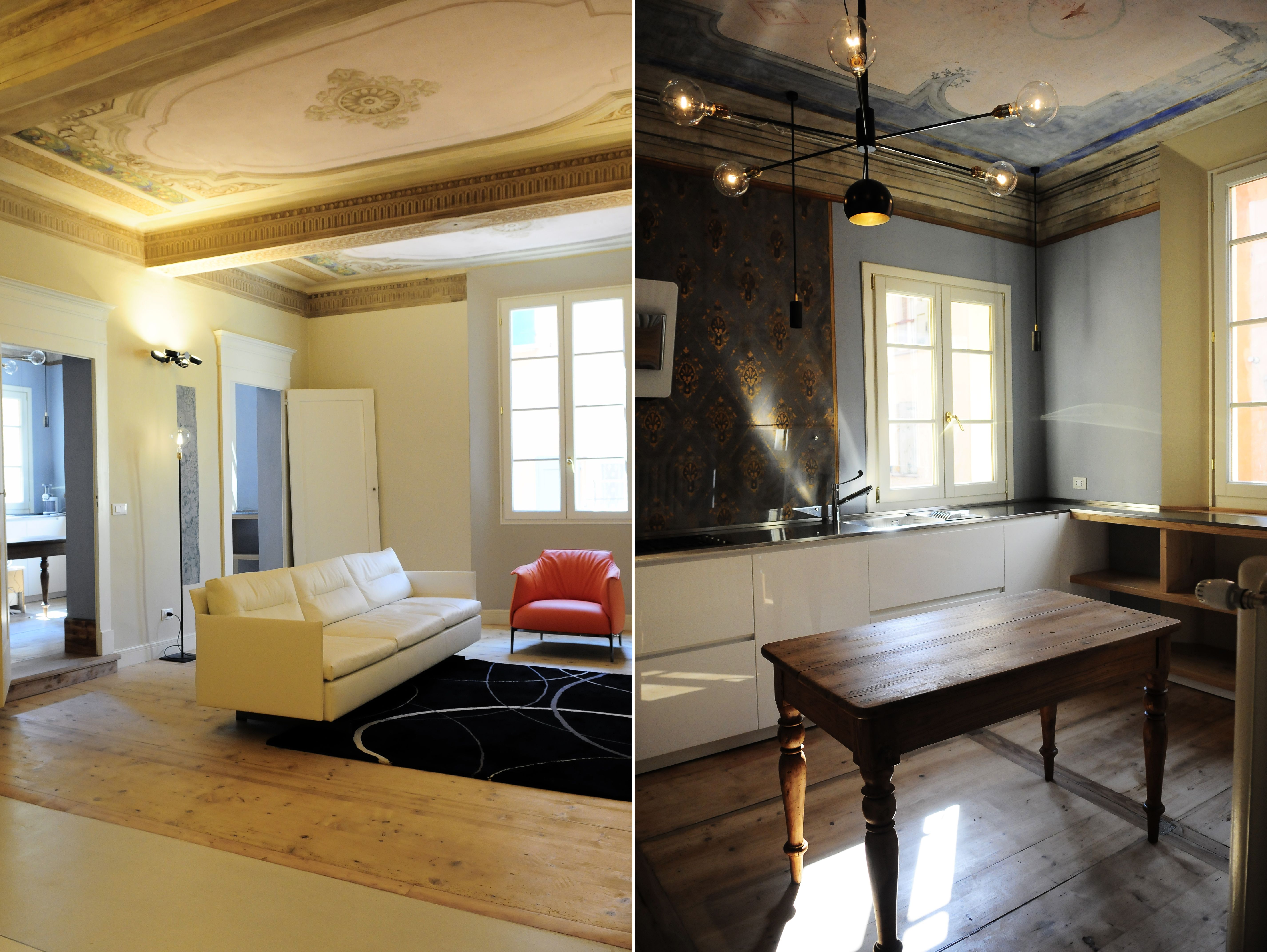Una porzione del piano nobile di una palazzo ”vecchia Bologna”, fatiscente e disabitato da qualche anno, viene ristrutturato mettendo a nudo la stratigrafia degli interventi che si sono succeduti in due secoli di storia. Se l’impianto viene solo minimamente modificato, per rendere la distribuzione degli spazi più funzionale alle esigenze dei clienti, gli infissi e gli impianti sono rifatti ex novo, e strutturalmente sono necessari degli interventi di rinforzo di alcuni solai lignei per metterli in sicurezza. Gli interventi maggiori si concentrano sulle superfici orizzontali e verticali: sotto due strati di carte da parati intrise di fuliggine e ammalorate dal tempo, vengono messi in luce dei decori primo Novecento e pitture settecentesche, che vengono mantenute a vista e restaurate, così come la palladiana che viene scoperta al di sotto del pavimento di un bagno e recuperata.