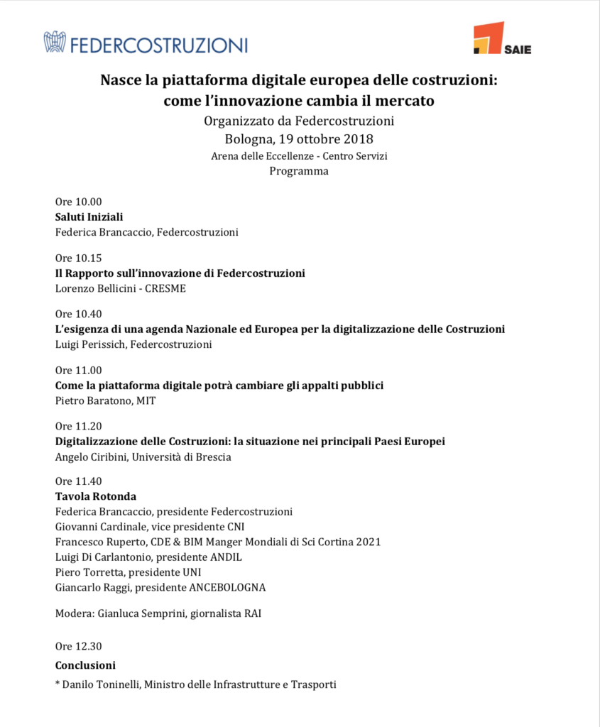 Durante l’evento verrà anche presentato il progetto della Piattaforma Digitale Europea delle Costruzioni e si dibatterà con importanti figure del mondo delle istituzioni, dell’industria, dell’università e delle professioni, sul ruolo che l’Italia deve assumente su questo importante progetto e su come l’innovazione digitale potrà trasformare il mercato delle costruzioni italiane e internazionali.