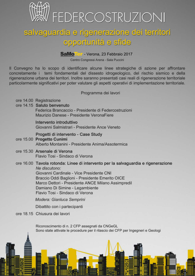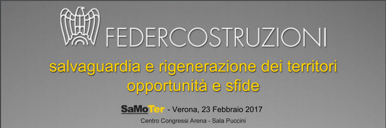 “Salvaguardia e rigenerazione dei territori – opportunità e sfide”: è questo il titolo del convegno di Federcostruzioni che andrà in scena giovedì 23 febbraio presso Samoter Veronafiere. Il convegno ha lo scopo di identificare alcune linee strategiche di azione per affrontare concretamente i temi fondamentali del dissesto idrogeologico, del rischio sismico e della rigenerazione urbana dei territori. Inoltre saranno presentati casi reali di rigenerazione territoriale particolarmente significativi per poter valutare gli aspetti operativi di implementazione territoriale.