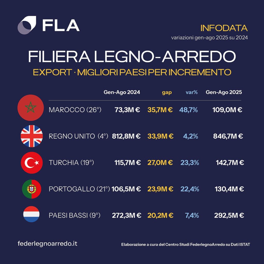 Altri mercati emergenti mostrano segnali incoraggianti: la Turchia cresce del 23,3% e il Portogallo del 22,4%, configurandosi come potenziali mercati di sviluppo per la filiera legno-arredo, sebbene ancora marginali in termini di volumi.