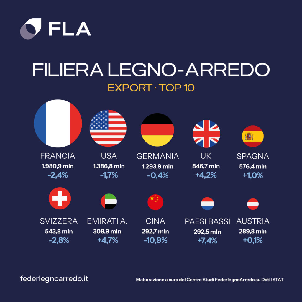 - La Francia, primo mercato di destinazione per la filiera legno-arredo, segna un calo del 2,4% con un valore complessivo di poco inferiore ai 2 miliardi di euro, risentendo della crisi del mercato interno.