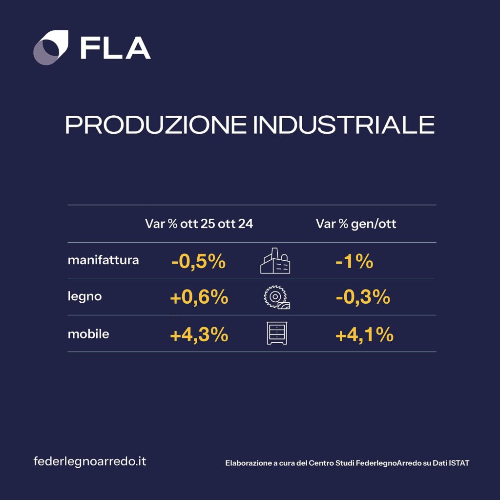 Sul fronte della produzione industriale, il comparto del mobile registra segnali positivi con un incremento del 4,3% a ottobre, confermando il trend positivo del periodo gennaio-ottobre (+4,1%).