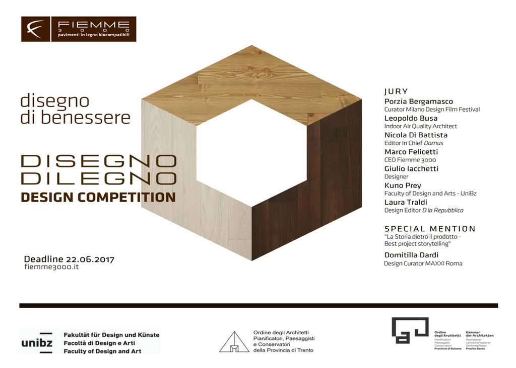 C’è tempo fino al 22 giugno per partecipare alla prima edizione di “DisegnoDilegno. Il tuo disegno di benessere realizzato con il legno”, il bando di concorso, a iscrizione gratuita, ideato e promosso da Fiemme 3000, azienda di Predazzo (TN) che produce pavimenti in legno biocompatibili, con la consulenza tecnico scientifica del professor Kuno Prey, il patrocinio della Facoltà di Design e Arti della Libera Università di Bolzano e degli Ordini degli Architetti delle province di Trento e di Bolzano.