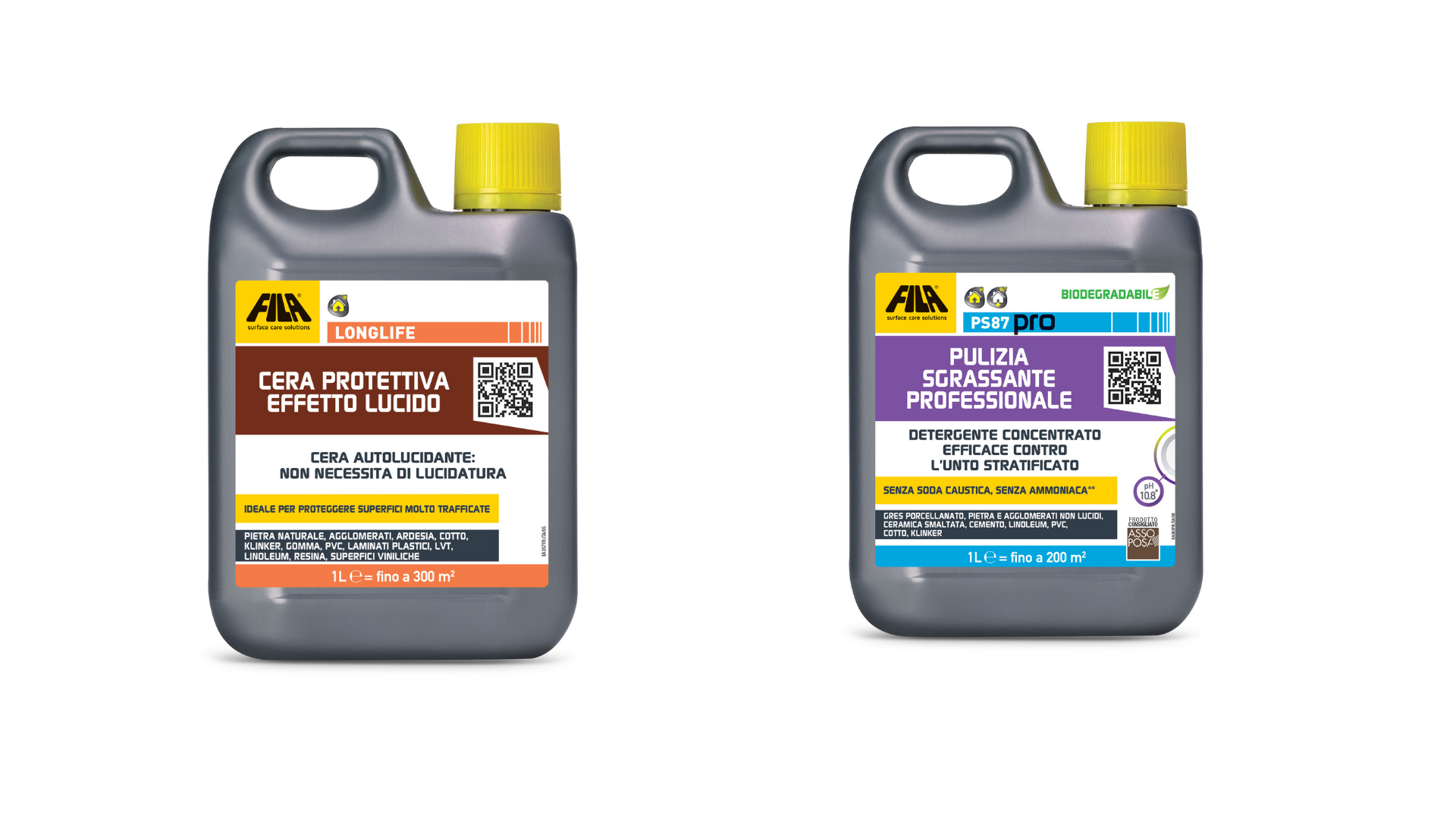 Le soluzioni messe in campo da Fila per la manutenzione ordinaria sono le seguenti: l’azienda ha inserito nel protocollo Cleaner Pro, ovvero il detergente professionale neutro non aggressivo e che non lascia residui. Inoltre è stato utilizzato Ps87 Pro, il detergente alcalino adatto a sgrassare e a rimuovere la cera superficiale. La ceratura delle pavimentazioni è stata eseguita con Longlife: si tratta di una cera a base acqua auto lucidante che dona un gradevole effetto lucido.