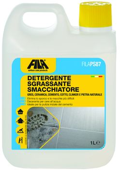 Detergente decerante sgrassante Fila PS87: diluito, pulisce e sgrassa pavimenti molto sporchi in gres porcellanato, ceramica, pietra naturale, cotto e cemento. Concentrato, smacchia il gres porcellanato dalle macchie impossibili. È eccellente per il lavaggio di base su pietre non resistenti agli acidi. Ideale per il lavaggio di base del cemento. Decerante per cere all’acqua, metallizzate e rilucidabili. Elimina il residuo di pretrattamento di gres porcellanato levigato lucido.