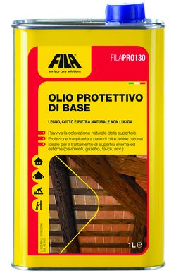 Olio protettivo di base Fila Pro130: olio protettivo è un impregnante a base di oli vegetali che entra in profondità nei materiali assorbenti come legno, terrecotte, pietre naturali (scure, prive di venature chiare). Può essere impiegato internamente come mano di base cui far seguire una finitura a cera o ad olio.