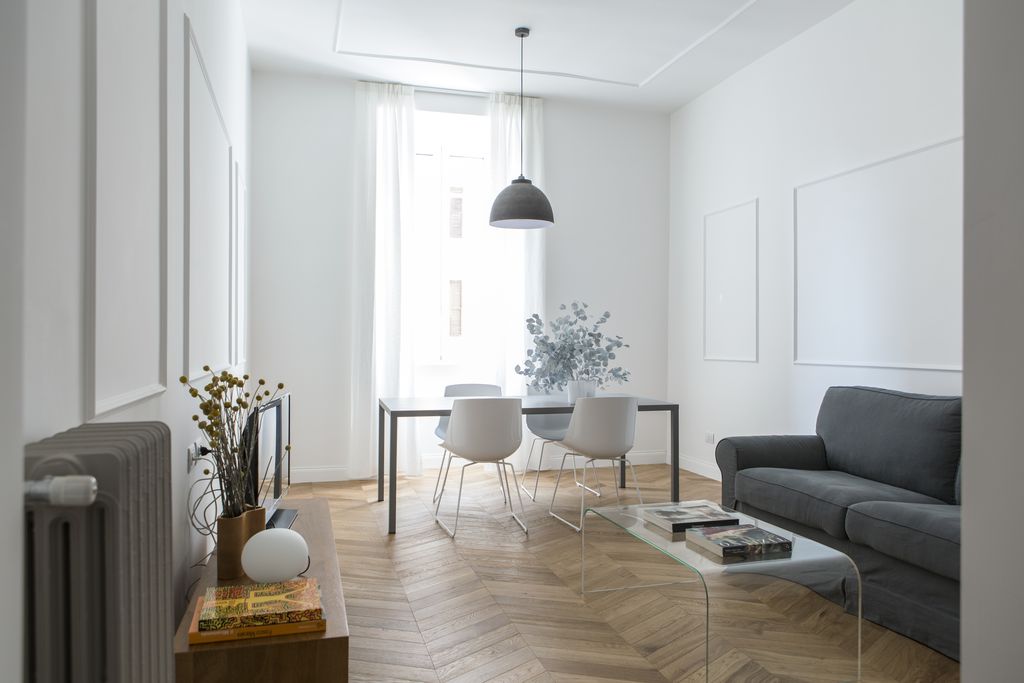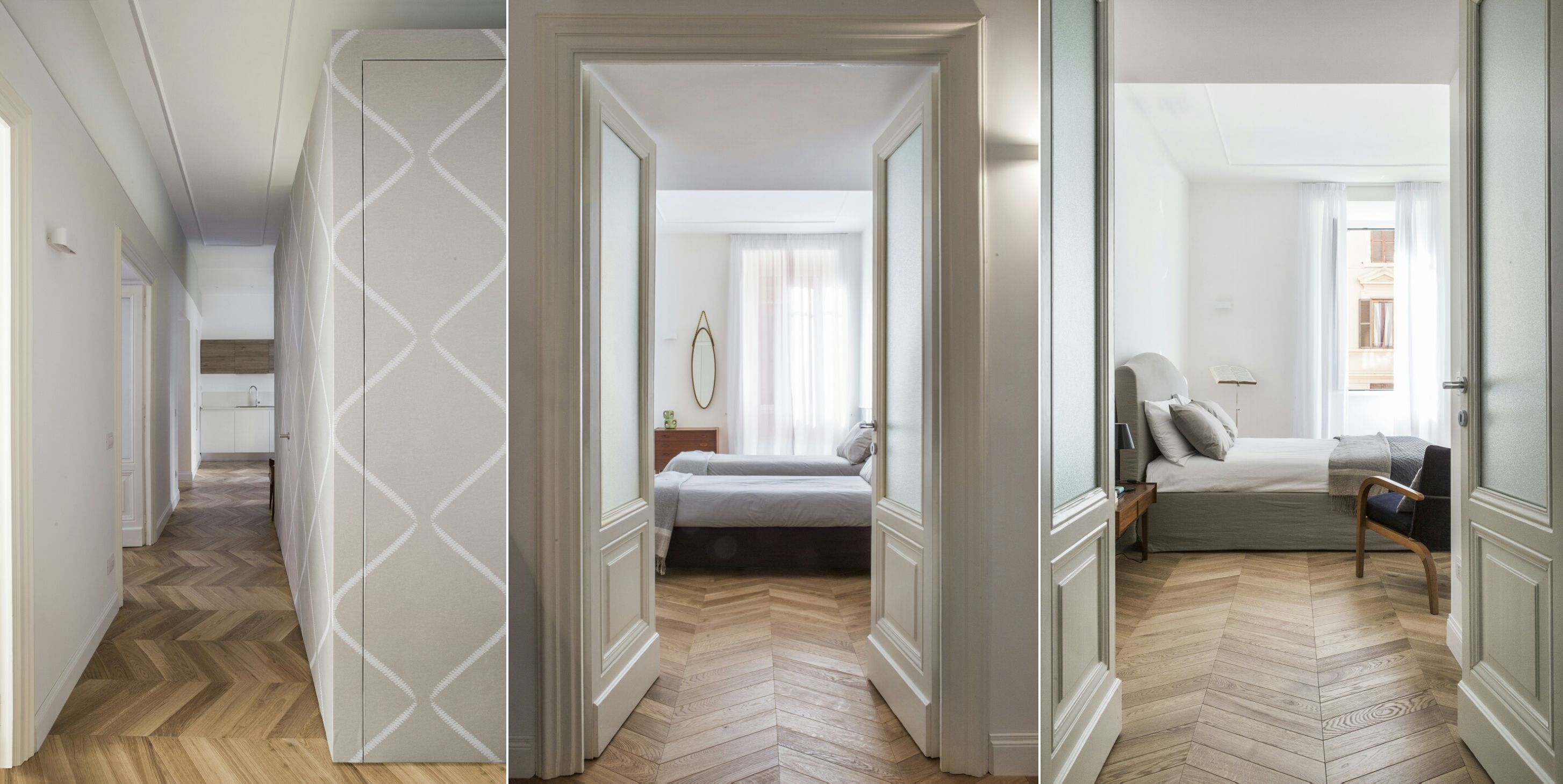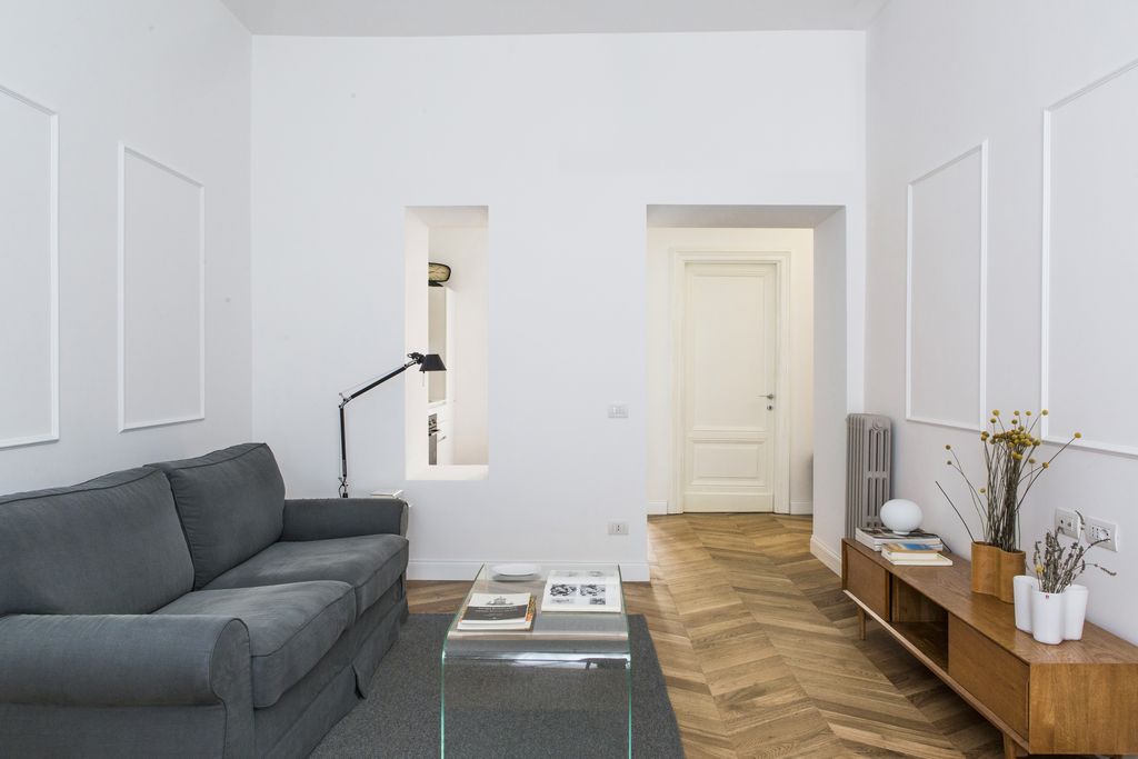 Una ristrutturazione che in termini spaziali si è risolta con un minimo intervento architettonico, a favore di un secondo bagno ricavato nel grande ingresso corridoio. In questo modo il bagno già esistente ha mantenuto la sua posizione originaria, e si è creato un corridoio più stretto e lungo su cui si affacciano le due camere e il soggiorno.