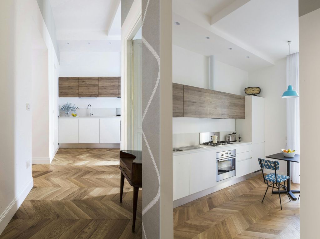 A fare da protagonista ed ad unificare esteticamente gli spazi, un elegante pavimento in legno di rovere posato a spina ungherese, che fa da sfondo ad arredi contemporanei e antichi, ad elementi di recupero, specchi, consolle, orologi accostati tra loro con grande equilibrio.