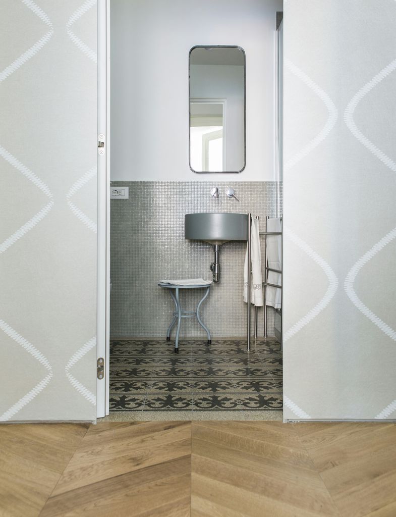 Oltre al rinnovo delle finiture e della dotazione impiantistica, che era oltremodo necessaria e imprescindibile, il cliente ha da subito espresso anche l’esigenza di poter avere un secondo bagno. L’intervento più importante è stato dunque la risistemazione dello spazio d’ingresso esistente, che prevedeva un ambiente abbastanza ampio ma poco funzionale “memoria di un lusso antico che dedicava spazio e agio a un luogo oggi troppo spesso considerato inutile”. Riducendo lo spazio dell’ingresso è stato possibile ricavare un piccolo secondo bagno, adiacente quello già esistente e creare un corridoio che conduce alla zona giorno e su cui si affacciano anche le due camere da letto. Il nuovo volume, che contiene anche un piccolo ripostiglio, vuole essere dichiaratamente avulso dal resto dell’abitazione, per forma e finitura: staccato dal soffitto per dare risalto alle cornici in gesso che lo perimetrano e completamente rivestito in carta da parati a disegno macroscopico che imita il movimento di un’onda bianca su fondo color tortora. All’interno, da cui si accede attraverso una porta rasomuro, l’atmosfera è sospesa tra passato e presente: marmette di graniglia bianche e nere originali, recuperate da una delle camere, rivestono l’intero pavimento, accostate ad un mosaico in tessere di pasta di vetro nei toni del grigio per le pareti e ad un piccolo lavabo in ceramica smaltata grigio lava. A completarne l’arredo un ampio box doccia trasparente e una coppia di sanitari sospesi.