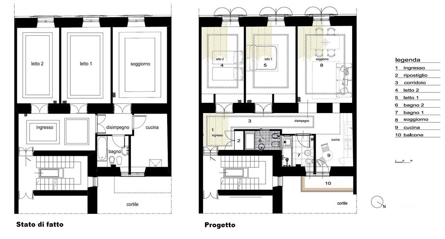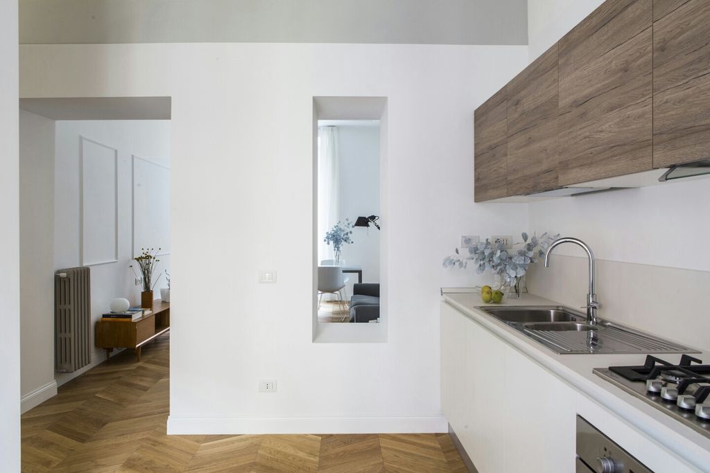 Il corridoio conduce alla cucina, uno spazio di dimensioni ridotte ma organizzato in modo funzionale e collegato al soggiorno non solo dall’apertura già esistente ma anche attraverso la realizzazione di una piccola “finestra” sulla spina muraria centrale che mette in comunicazione visiva i due ambienti.