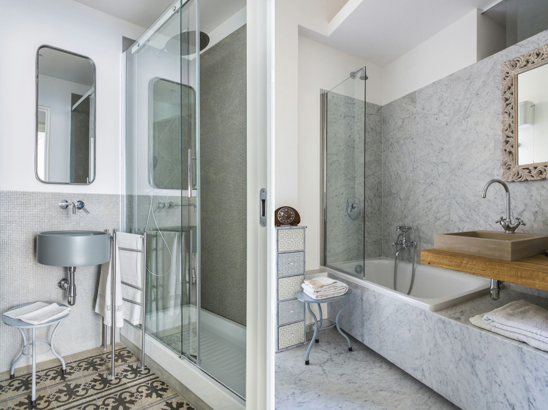 L’altro bagno, più ampio e finestrato, ripropone i toni del grigio con un rivestimento in marmo di Carrara per le pareti adiacenti la vasca attrezzata anche per la doccia. Nel resto della casa è stato mantenuto l’aspetto distributivo originario, con un muro portante che separa in due l’appartamento e all’interno del quale sono scandite le entrate alle camere da letto e al soggiorno.