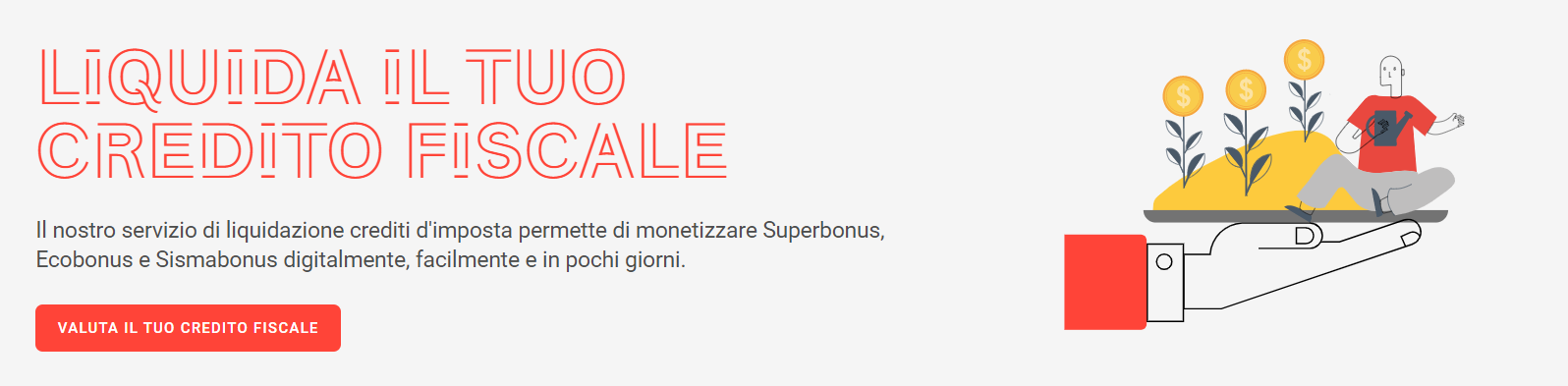 I crediti d’imposta che Finanza.tech acquisisce sono quelli legati a Superbonus 110% cod. tributo 7711, 7718, 6921, 7701 e crediti decennali (bonus facciate, ecobonus…) cod. tributo 6922, 6925, 7705, 7712, 7715. Il servizio è rivolto solo ad aziende partendo da un importo minimo di € 50.000,00 per il 2023.