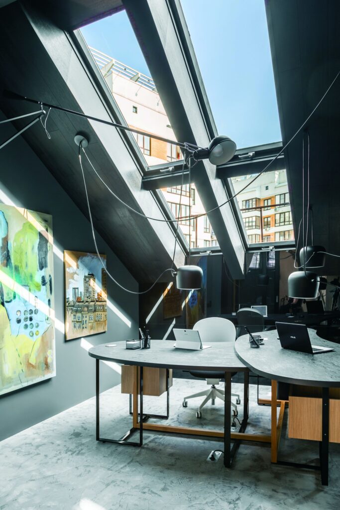 A Krasnodar, nel sud della Russia, è stato da poco realizzato un ufficio privato, esempio significativo delle capacità espressive tipiche degli ambienti mansardati, caratterizzati da geometrie inusuali, da forti contrasti chiaroscurali e da visuali che, per effetto dell’inclinazione delle vetrate, sono rivolte verso il cielo.